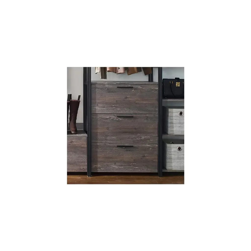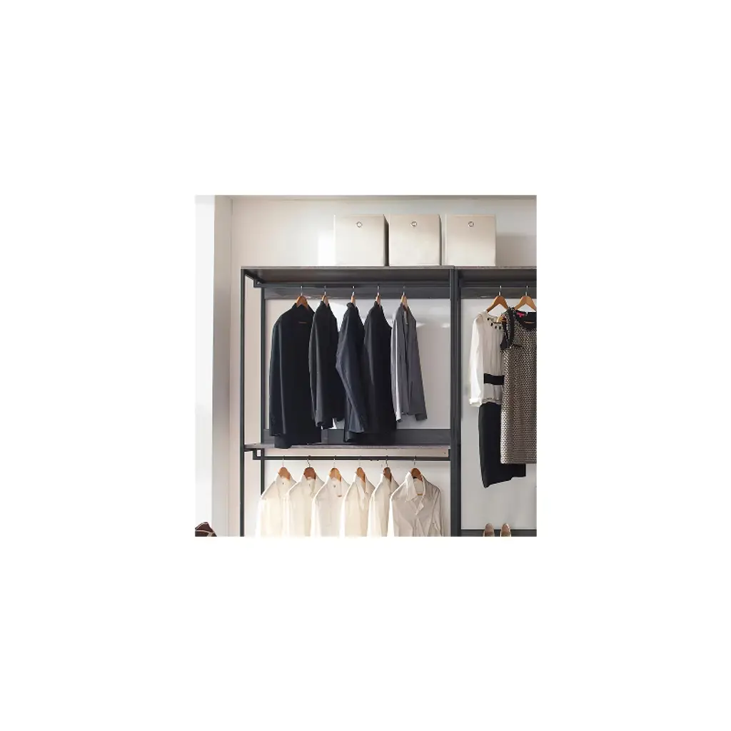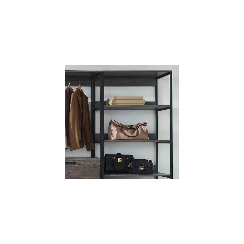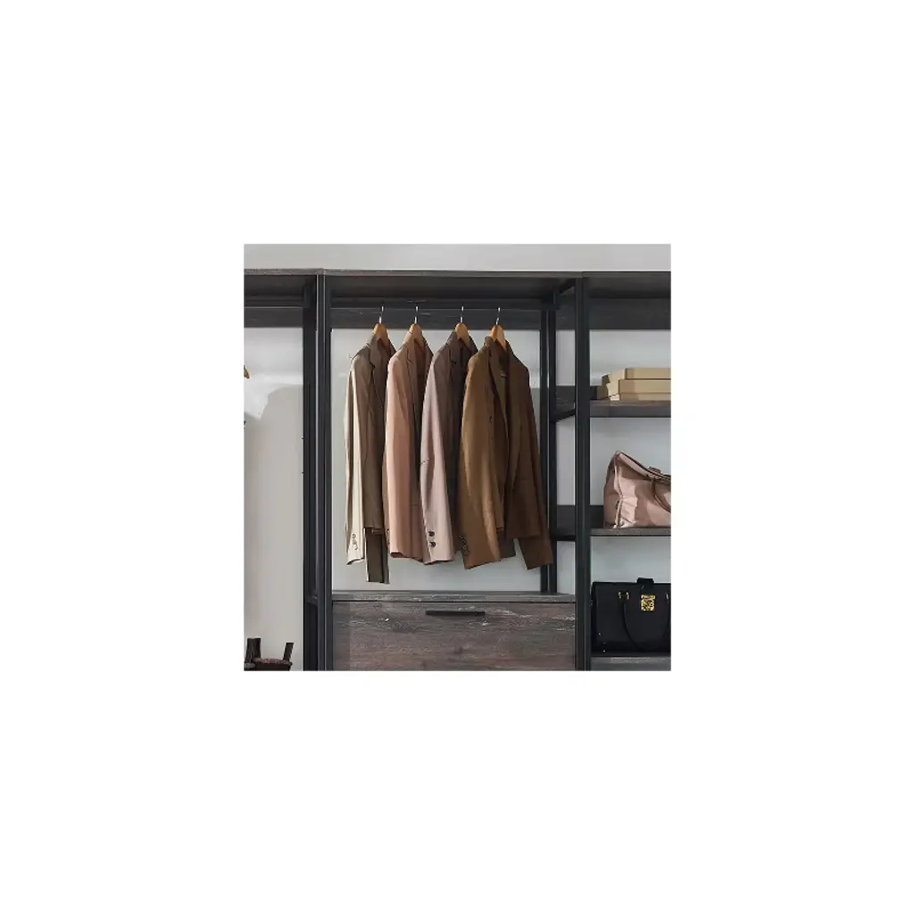 Organize your wardrobe with the HomeStock Monica Walk-In Closet System. This versatile closet organizer allows for customized configuration to meet your specific storage needs. A generously sized drawer offers ample space for storing accessories like purses and shoes, keeping them neatly tucked away. The weathered wood finish paired with a sleek black metal frame creates a stylish and functional addition to any bedroom, blending rustic charm with modern design.