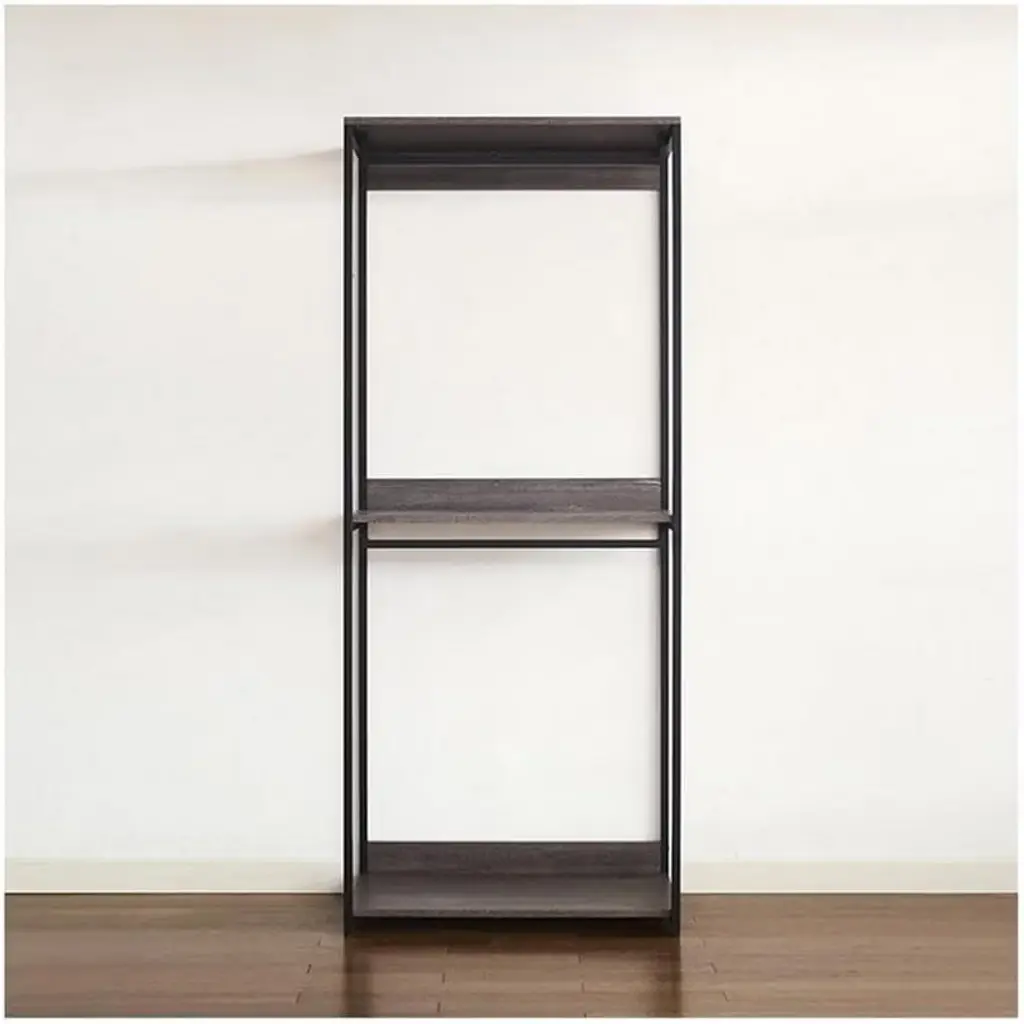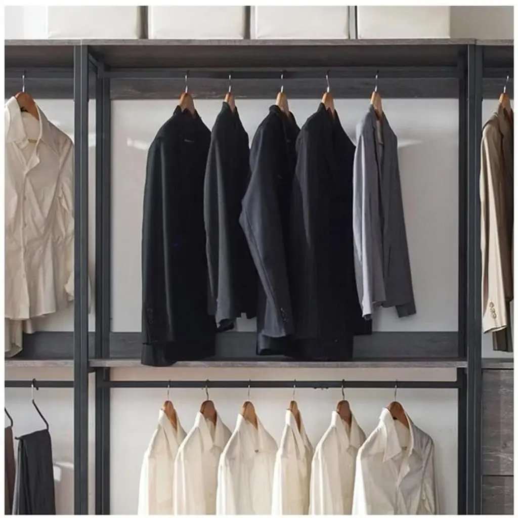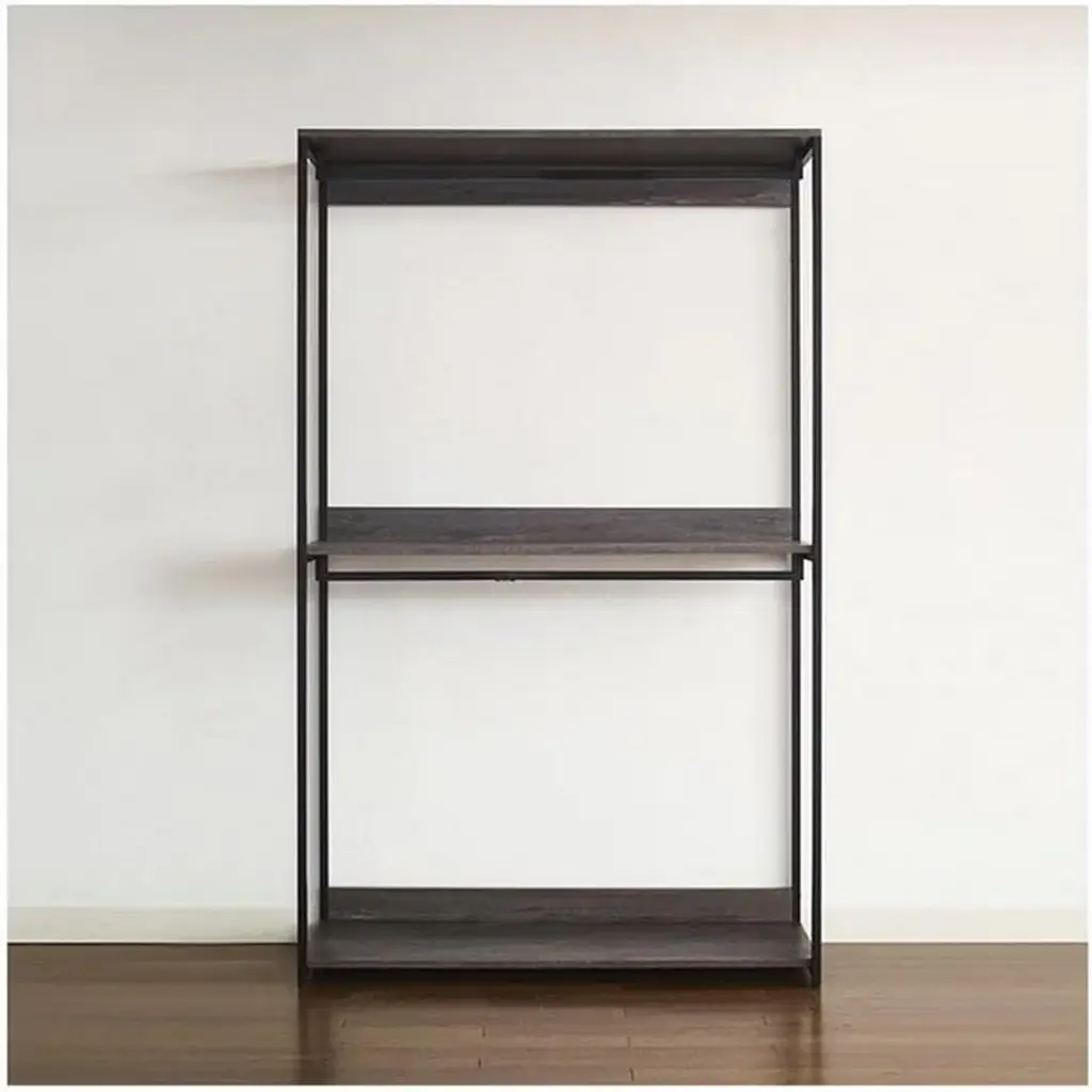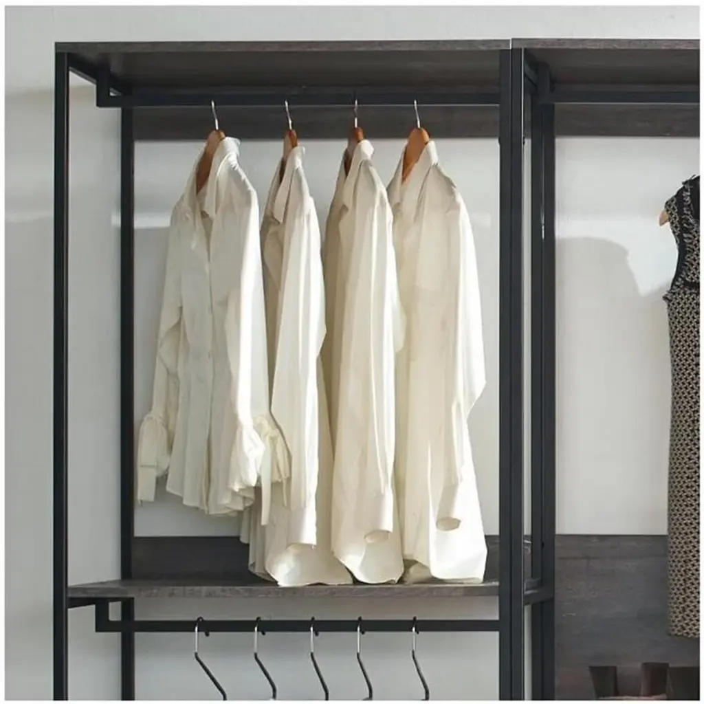 Organize your wardrobe with the HomeStock Monica Walk In Closet System. This versatile closet organizer allows for customized configuration to meet your specific storage needs. A generously sized drawer offers ample space for storing accessories like handbags and footwear, while the weathered wood finish paired with a sleek black metal frame brings a touch of modern style to your closet space. Enjoy a functional and fashionable solution for keeping your belongings neatly arranged and easily accessible.