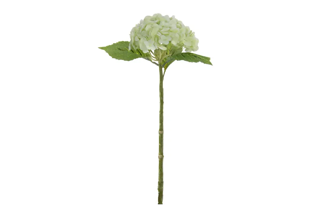 This faux hydrangea lends a fresh, ethereal touch. Its tall stem supports a beautiful blossom of soft green flowers complemented by lifelike leaves. Create a sophisticated look by clustering multiples together or pairing with the white hydrangeas.