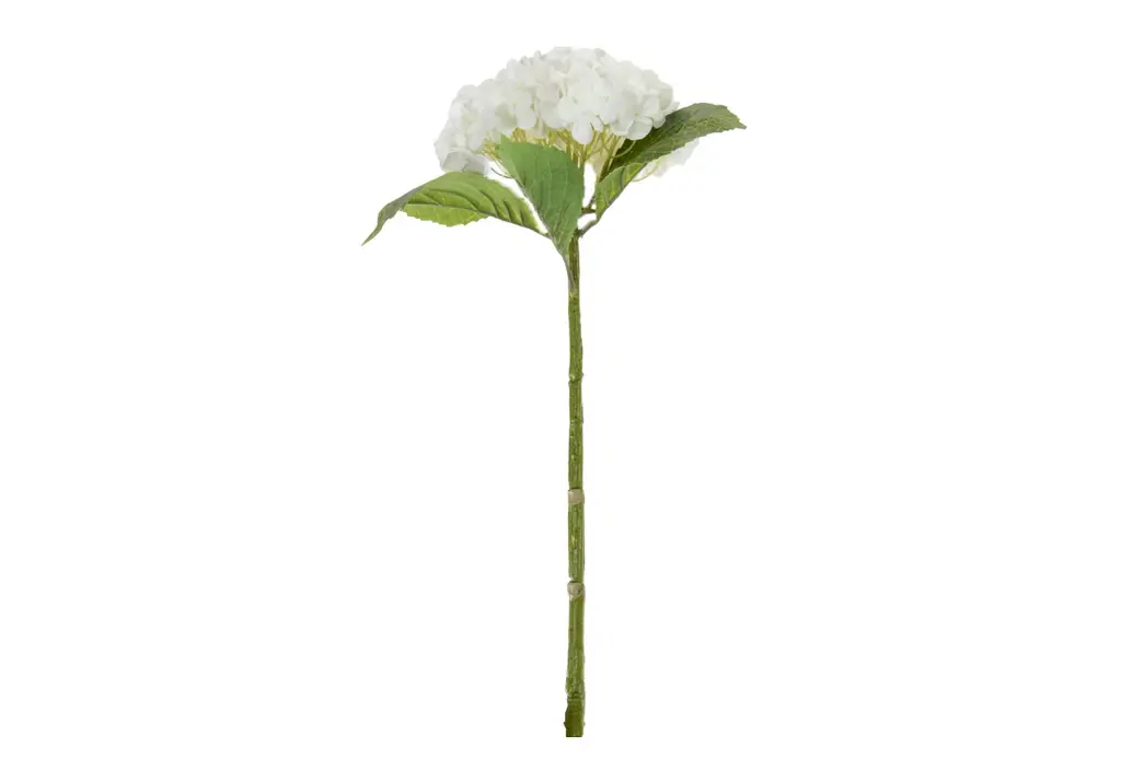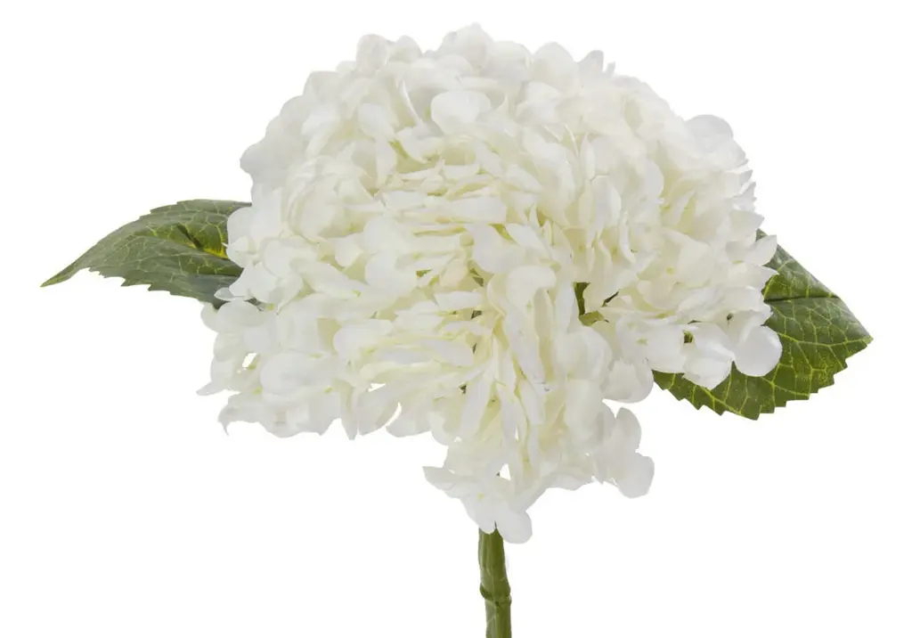 This faux hydrangea lends a fresh, ethereal touch. Its tall stem supports a beautiful blossom of lifelike white flowers complemented by green leaves. Create a sophisticated look by displaying clustering multiples for an elevated design.