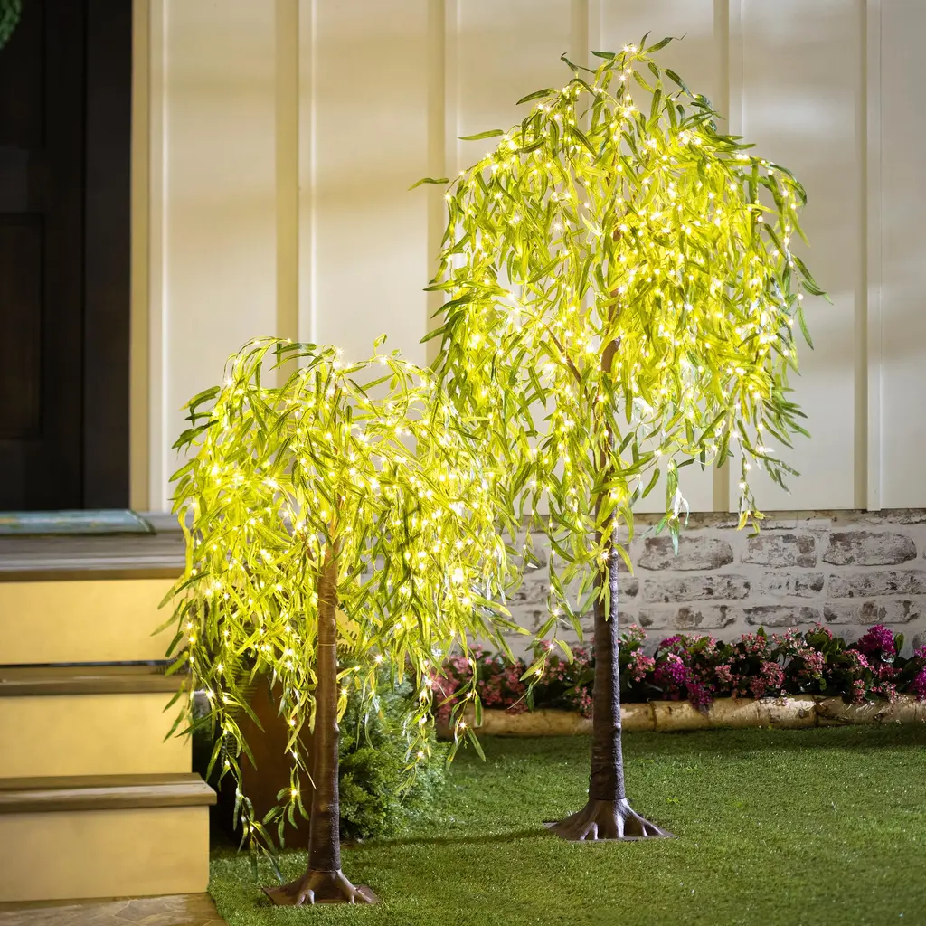 Our beautiful, realistic Lighted Green Willow Trees go indoors or out to add substance, style and sparkle anywhere. With their lifelike foliage and warm white LED lights, you can add a charming glow to your décor or landscape any time of year.The willow leaves, crafted of fabric, have realistic detail, bringing the look of nature to your home. It couldn't be easier: just plug in and enjoy! Posable branches are studded with warm white LED lights help you create a lovely display in no time.Each tree comes with a removable mounting base and four ground stakes to place on a floor, in a planter or stake in the ground. You can get creative and wrap the base with burlap or faux moss and place the tree in a pot or decorative container (not included).Each electric tree has a 16'L lead cord with all-weather, outdoor UL-approved adapter. Size is approximate. Wire and plastic construction for indoors or out. Easy assembly. Imported.