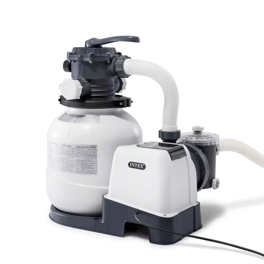 The Intex 2100 GPH Above Ground Pool Sand Filter Pump w/ Auto Timer (Model #26645EG) provides cool, refreshing, clear water, and less hassle every swim season. If you are tired of buying and replacing pool filter cartridges, this filter is the one for you. With virtually no maintenance, your sand pump only needs replacement every five years. This sand pump features a powerful motor, 6-function control, and a built-in automatic timer. It meets the UL standards and is an excellent upgrade to the filter cartridge system on your Intex Above Ground Swimming Pool (Easy Set, Metal Frame, and Ultra Frame up to 12,800 gallons). This package also includes the Intex Krystal Clear Saltwater System. Its unique 2 stage technology uses an E.C.O. (electrocatalytic oxidation) process in which water molecules are split into highly powerful oxidants. Next, the amount of chlorine generated by this saltwater system is greatly reduced, which results is clean water without the potential harsh side effects of packaged pool chemicals. It requires a filter pump with a flow rate between 700 to 3,000 gallons per hour and is for use with a maximum pool size of 15,000 gallons so it pairs perfectly in this set. Maintenance is a part of every swimming pool and with this Intex Pool Sand Filter Pump and Krystal Clear Saltwater System you'll have easy to use tools for the job, cutting down on your time spent cleaning.
