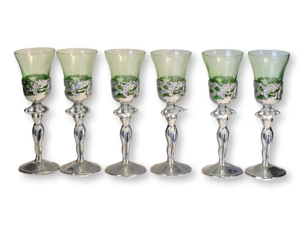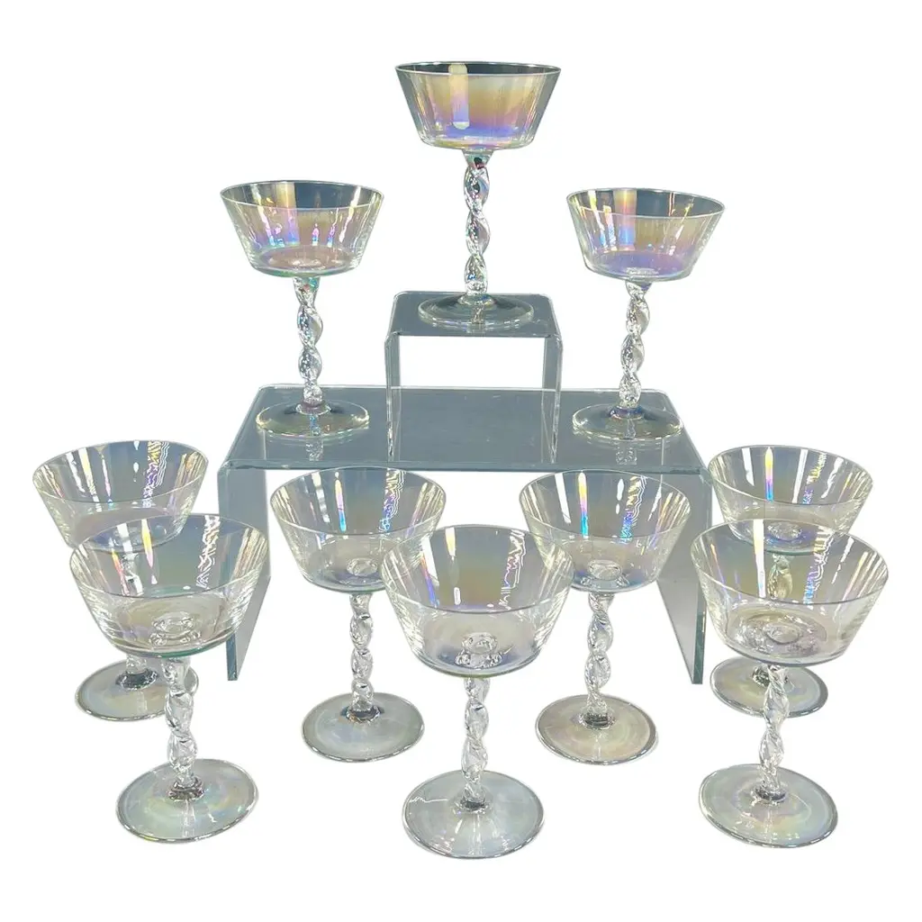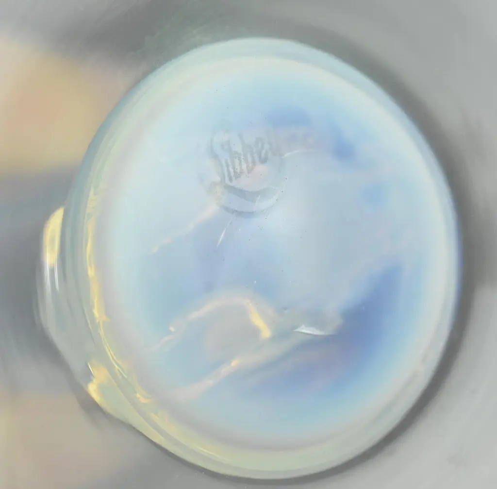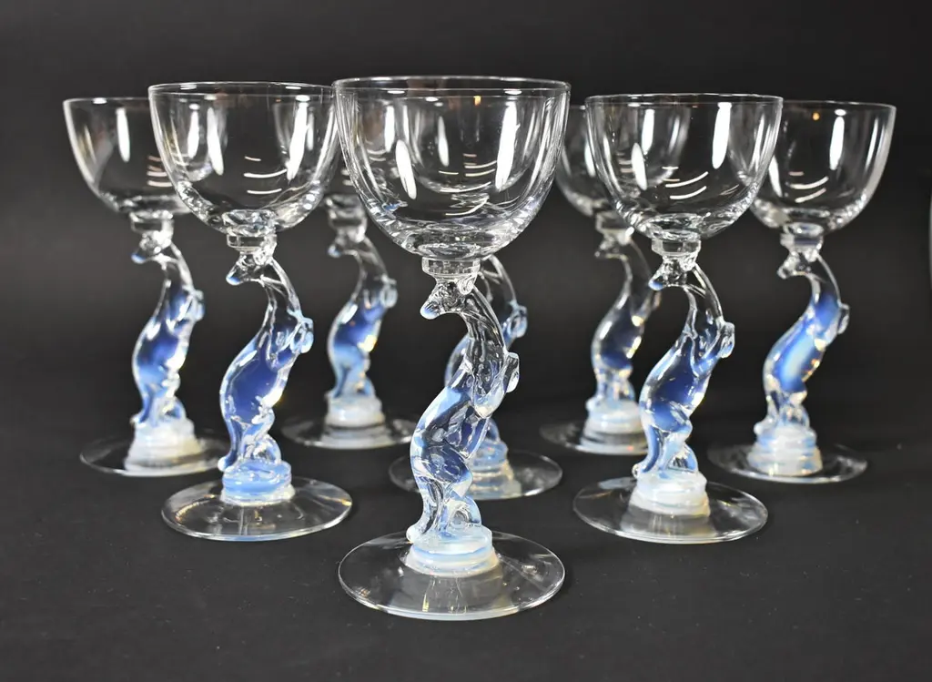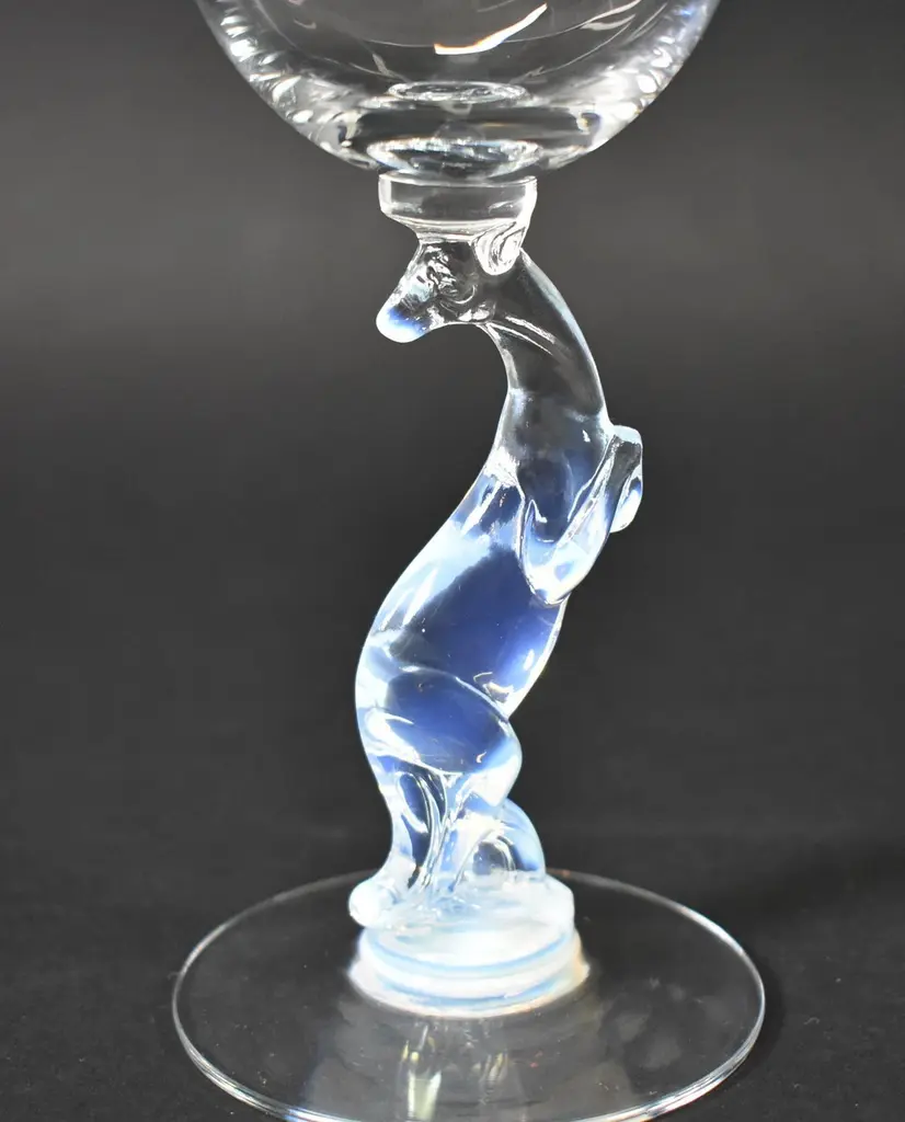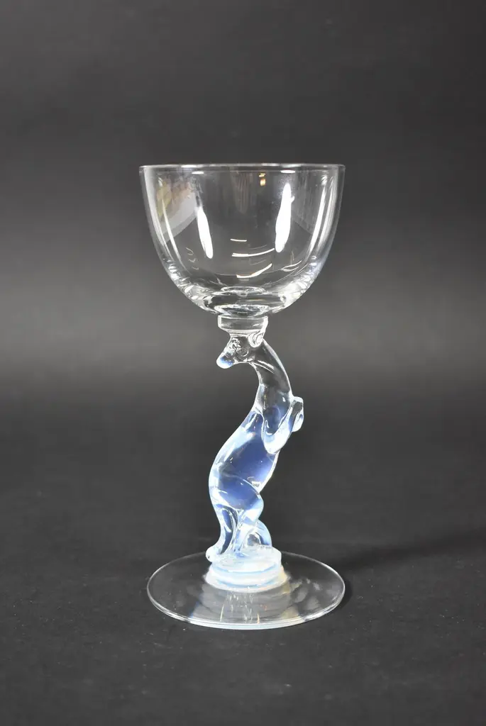 Rare 1933 Libbey Silhouette Nash Series moonstone liqueur cocktail glasses with charming kangaroo stems in opalescent glass designed by Douglas Nash. Libbey mark is acid etched on the bottom. 6" tall x 2 3/4" diameter. Price is per piece.
