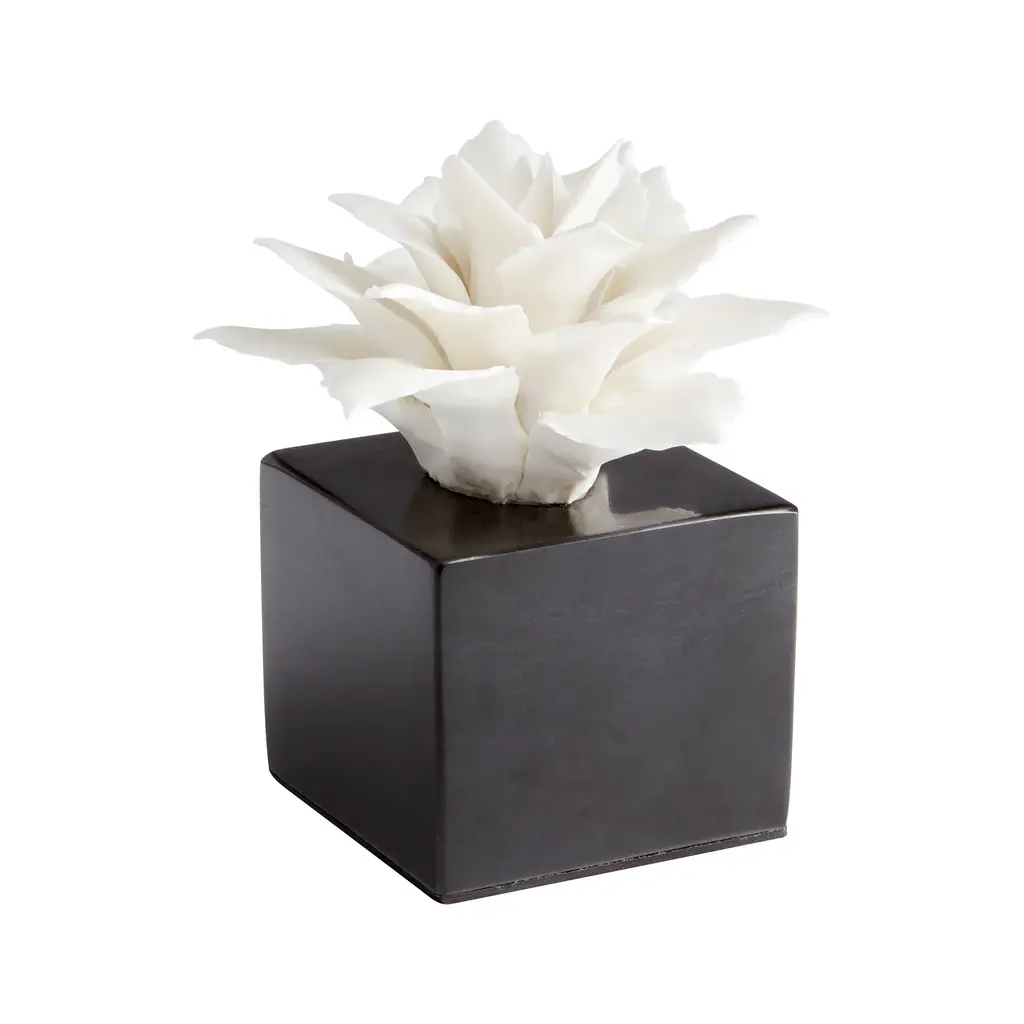 7"H x 5"W x 5"D Gold dust roses set in a black cube porcelain vase with natural golden reindeer moss.