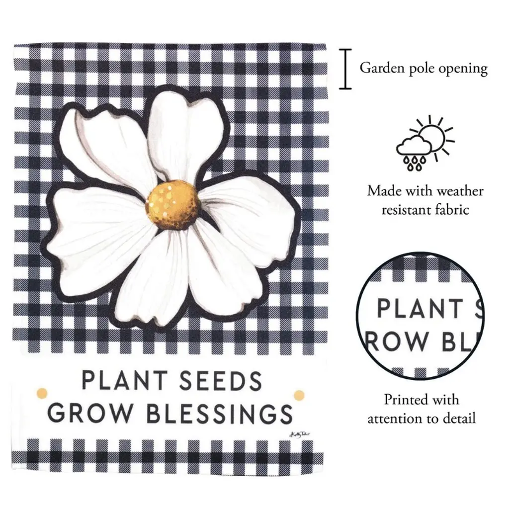 This garden flag by Magnolia Garden is designed with a combination of fabric appliques and exquisitely detailed embroidery on both the front and back; Flagpole sold separately. Features the words, "Plant Seeds Grow Blessings" in trendy font beneath a large white daisy set on a check plaid background. Made of quality polyester double thickness material; These flags are heavier than most others on the market and will hold up for longer, They will retain its color and beauty for years if displayed in shade or semi-shade, and is rainproof; Measures approximately 13 inches wide and 18 inches tall. Perfect for displaying in a garden, on its own or as part of a garden display year-round; Fits most standard garden poles, sold separately; Care Instructions: Handwash in cold water, Air dry with no heat. Contained in protective packaging; Ready for easy gifting for a housewarming, birthday, or any special occasion