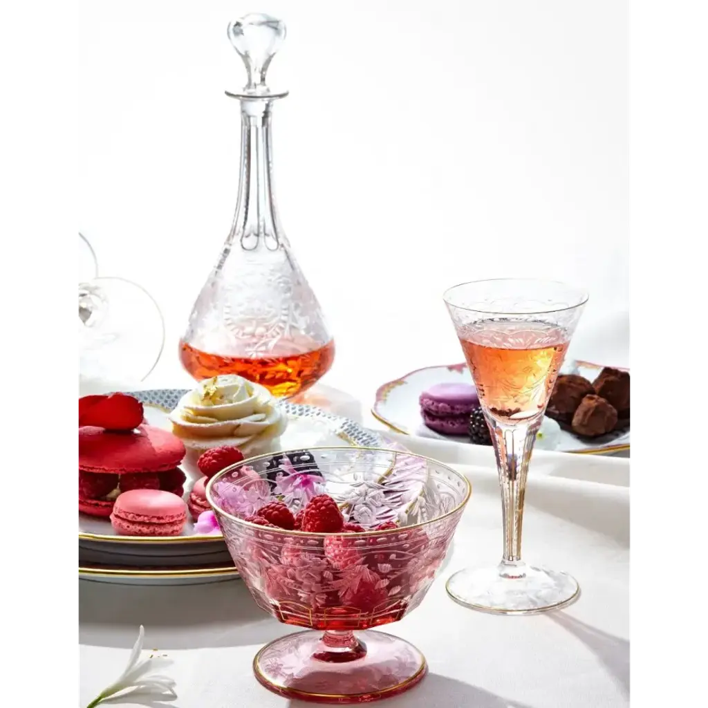 This hand-blown, hand-cut liqueur glass is adorned with a delicate floral motif, subtly complemented by gold stripes and a pearl cut by the Moser glassmasters. The graceful goblet is supported by a thin stem with a precision six-sided cut. Lead-free crystal, be it in the clear version or one of the typical Moser colours, allows the taste and the colour of the drink to really shine through. Founded in 1857, Moser boasts a long tradition of superior artistic and technical standards in lead-free crystal. The quality of the crystal and perfection of Moser's hand cutting, engraving, gilding and brilliant colors are unsurpassed by any contemporary glass or crystal company in the world. Created by Ludwig Moser & Sons, the line originated as an engraving studio in the spa town of Karlsbad, located in Bohemia (now the Czech Republic), a region with deep roots in superior glass-making. During the late 19th and early 20th centuries, Moser developed its now famous technically perfect crystal production, employing a unique formula for producing a substance as hard as rock and as brilliant as lead crystal - but without using a trace of lead. This composition is very suitable for Moser's marvelous engravings, is ecologically sound and remains free of all concerns associated with lead. Moser's innovative techniques in cutting, engraving and coloring quickly won the line great acclaim at many prestigious international art exhibitions. Soon Moser became the proud possession of royalty, heads of state and well-known personalities throughout the world, an esteemed reputation that has held fast and continues to grow now in the 21st century. Today, Moser produces a wide range of stem and barware, holloware, accessories, giftware and art glass, all showcasing the superior quality, innovation and remarkable artistic expression for which the line has long been recognized.