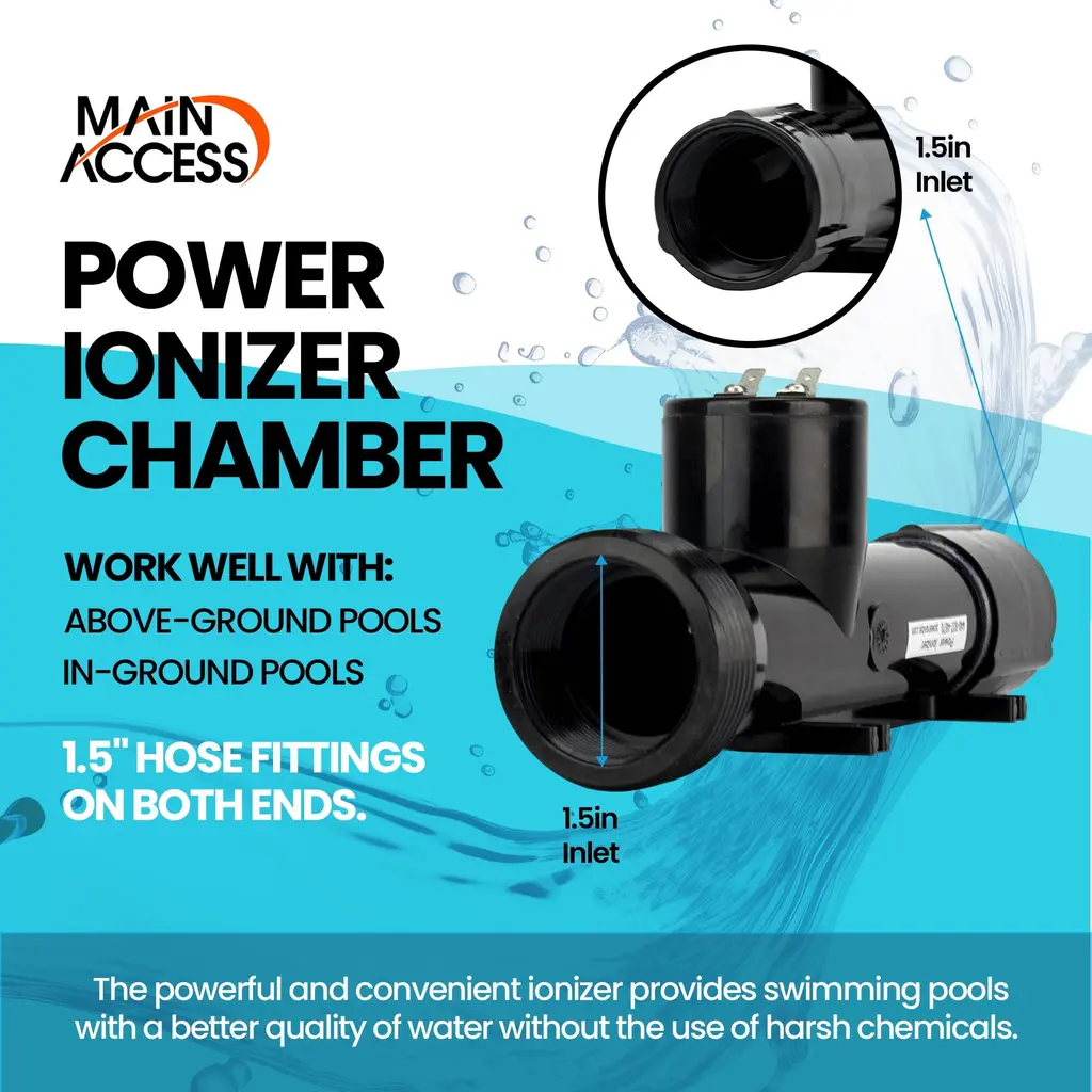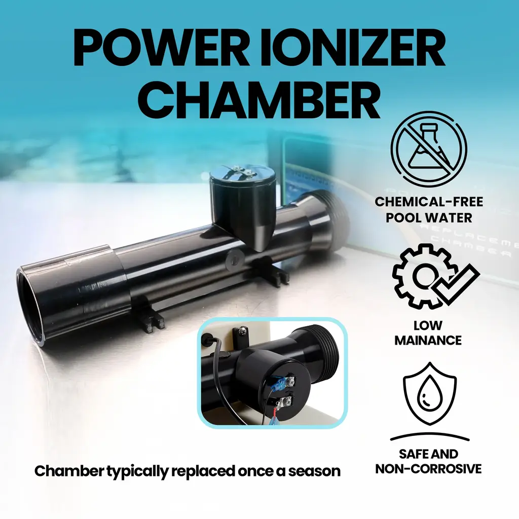 Keep your pool water clean and clear all season long with the Main Access Power Ionizer Replacement Chamber. This chamber is designed to be used with the Power Air Ionizer Hybrid Pool Water Treatment System. With its pH neutral process and natural minerals, it improves the clarity and quality of your water without the use of harmful chemicals. Say goodbye to itchy skin, irritated eyes, and chlorine odors after swimming. The Power Ionizer Replacement Chamber reduces the time and effort you spend on pool maintenance, letting you enjoy crystal clear water year after year.Features:Additional Information: