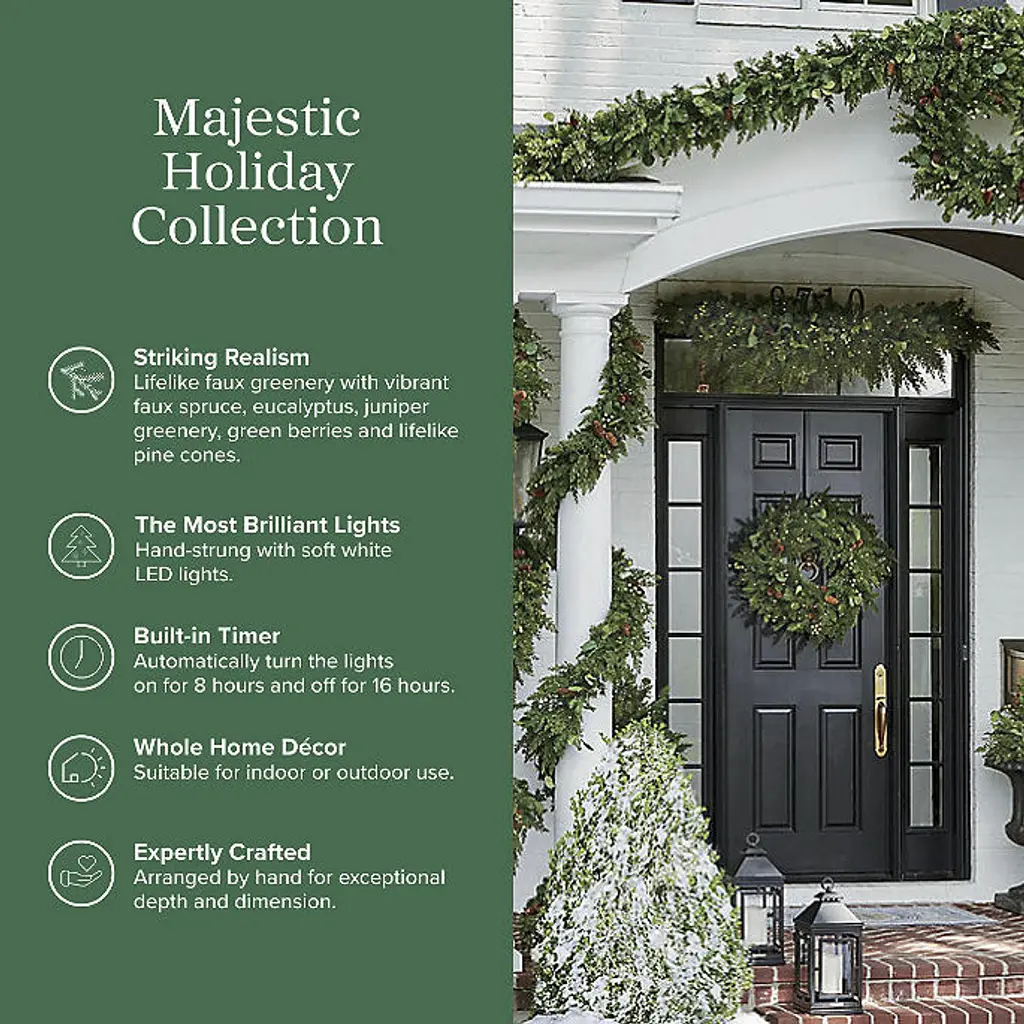 Vibrant faux green berries and delicate eucalyptus leaves enhance the lush realism of the Majestic Holiday Outdoor Cordless 3 ft. Teardrop Swag. This stunning arrangement perfectly captures the rich tones and textures of spruce, eucalyptus, juniper greenery, green berries and pine cones. It's nearly indistinguishable from fresh-cut foliage, yet its beauty will last for seasons to come. For indoor or covered outdoor use Polyethylene, PVC, wire and lifelike pine cones 50 warm-white short-tip LED lights Built-in timer option automatically turns the lights on for 8 hours and off for 16 hours To maximize the life of your greenery, we recommend a limit of 3 months of outdoor exposure per year Fluff and shape greenery after unpacking Requires three "C" batteries (not included) Wipe clean with a soft, dry cloth or duster Imported A Frontgate exclusive. At Frontgate, our primary focus is quality. We guarantee that every product we sell will stand up to the supreme test – our customers' satisfaction. To learn more about our policies, visit our Shipping & Processing, Returns & Exchanges and Warranty & Price Guarantee pages.