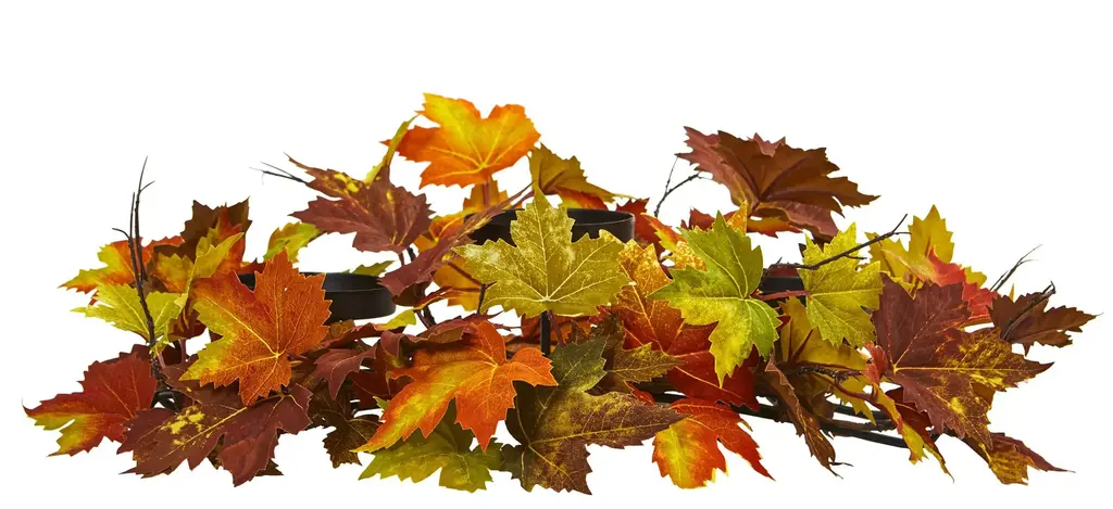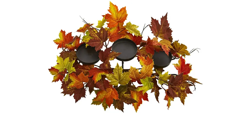 Three black candelabrums stand out as accent pieces against the surrounding red, green, and orange maple leaves. Place this elegant ornament on a single dresser or small bookshelf to bring light to the corners of your room.