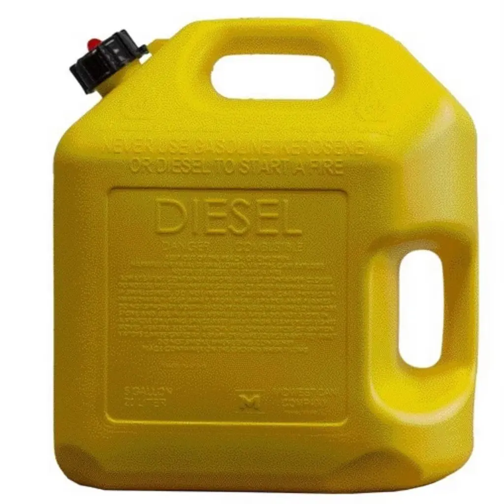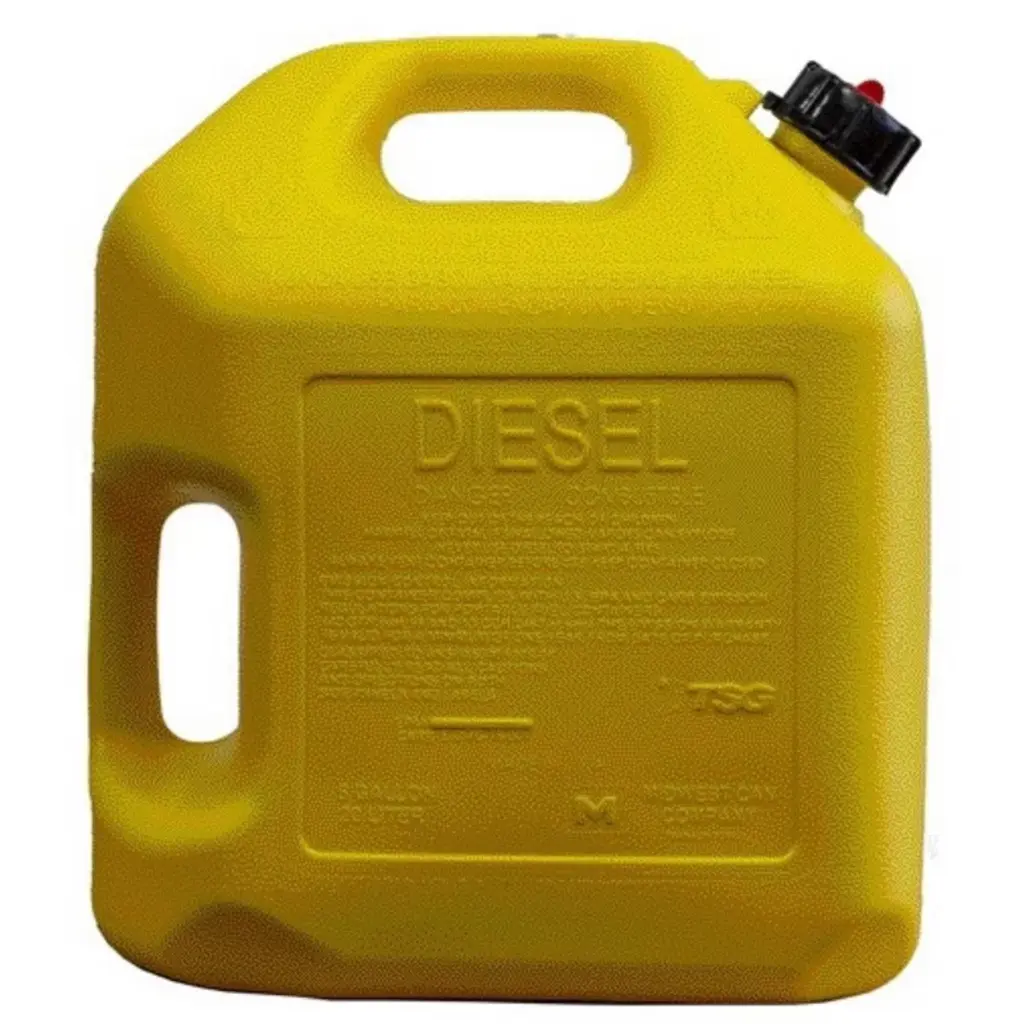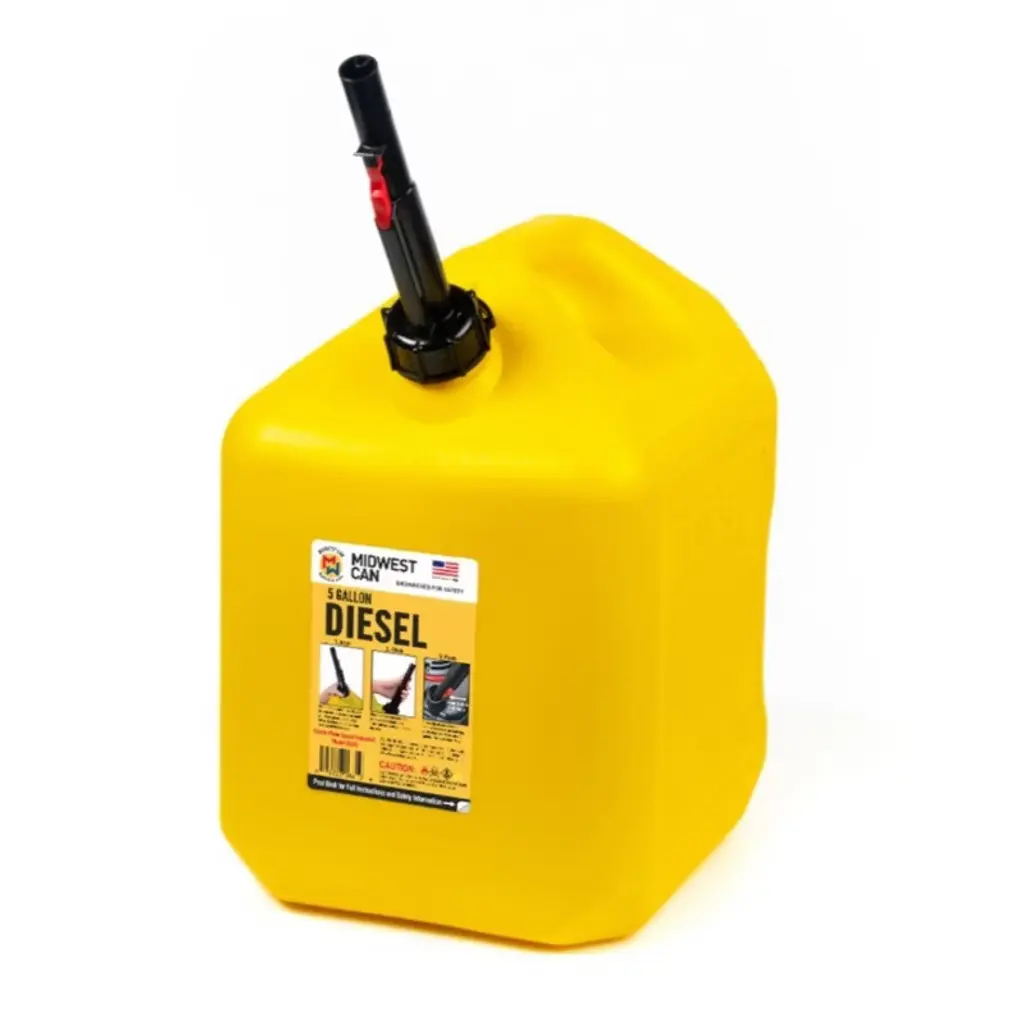 The Midwest Can 5-Gallon Diesel Can is part of the Safe-Flow line of portable fuel containers, engineered for maximum safety and convenience. Designed to hold up to 5 gallons of diesel fuel or oil mixes, this can is perfect for safe storage and transfer whether at home, on the jobsite, or in the field. Built with FlameShield Safety System technology, the can offers double-layer protection with a flame mitigation device and vapor-locking spout to help prevent flashback ignition and spills. The included Quick-Flow spout ensures fast, controlled fueling for a cleaner, more efficient transfer. Made from durable HDPE with barrier materials, it virtually eliminates hydrocarbon emissions and exceeds CARB and EPA standards for portable fuel containers. The Midwest Diesel Can is engineered for safety!