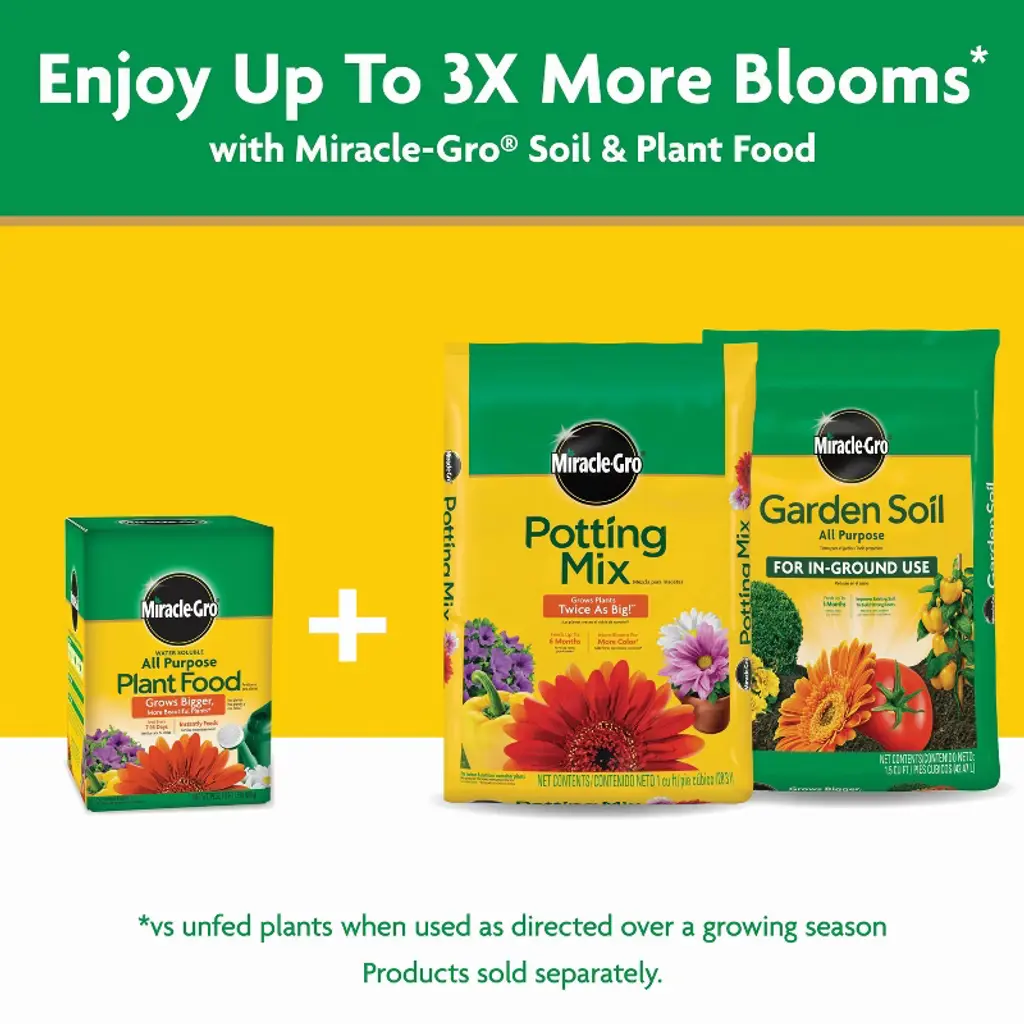 Miracle-Gro® Water Soluble All Purpose Plant Food instantly feeds vegetables, trees, shrubs, and houseplants to grow bigger and more beautiful than unfed plants. Simply feed them every 1-2 weeks. The formula is safe for all plants, and is guaranteed not to burn when used as directed. Get beautiful results with Miracle-Gro®.