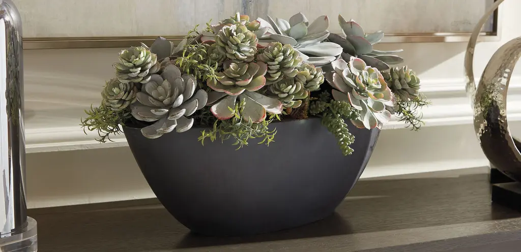 Subtle yet sophisticated: This centerpiece of mixed succulents, shown here in a wonderfully textured oval planter, is a lovely addition to any tabletop. Large in scale, it adds welcome warmth to modern décor; its nature-inspired beauty also breathes life into traditional settings.