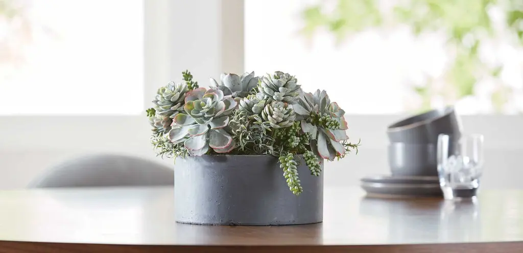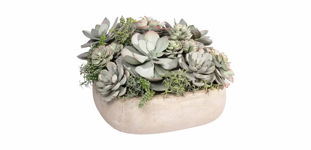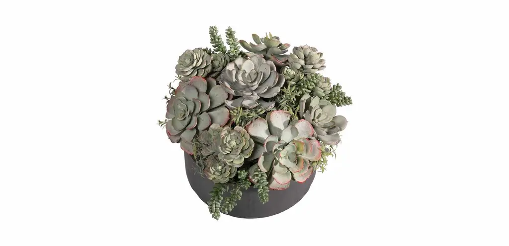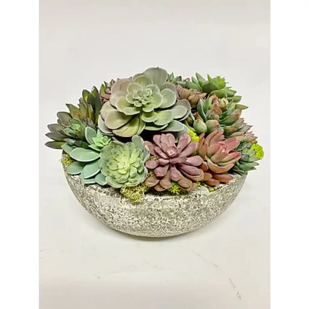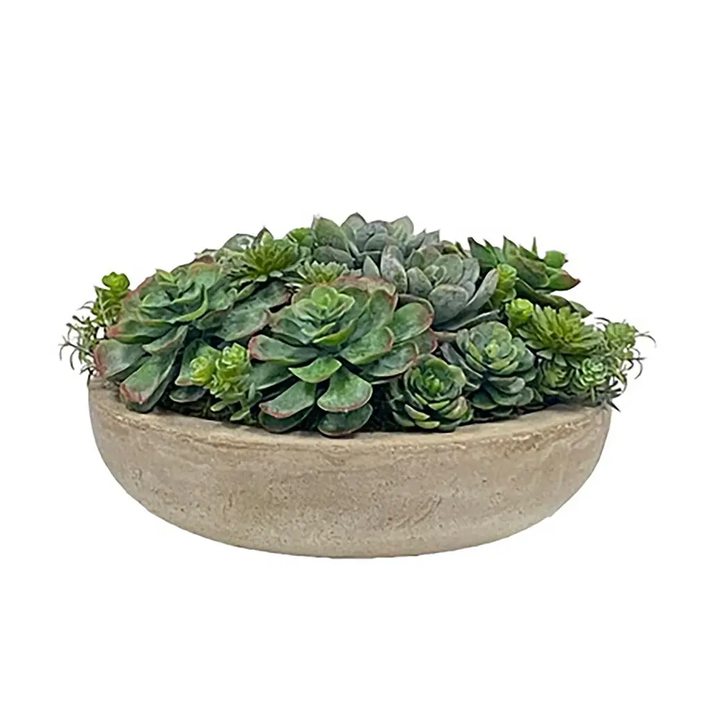 Hardy and verdant, gray-green succulents are wonderful additions to indoor and outdoor gardens alike. Let this handcrafted arrangement of mixed succulents, in a simple round resin bowl that complements any style setting, add nature-inspired beauty to any corner of your home.