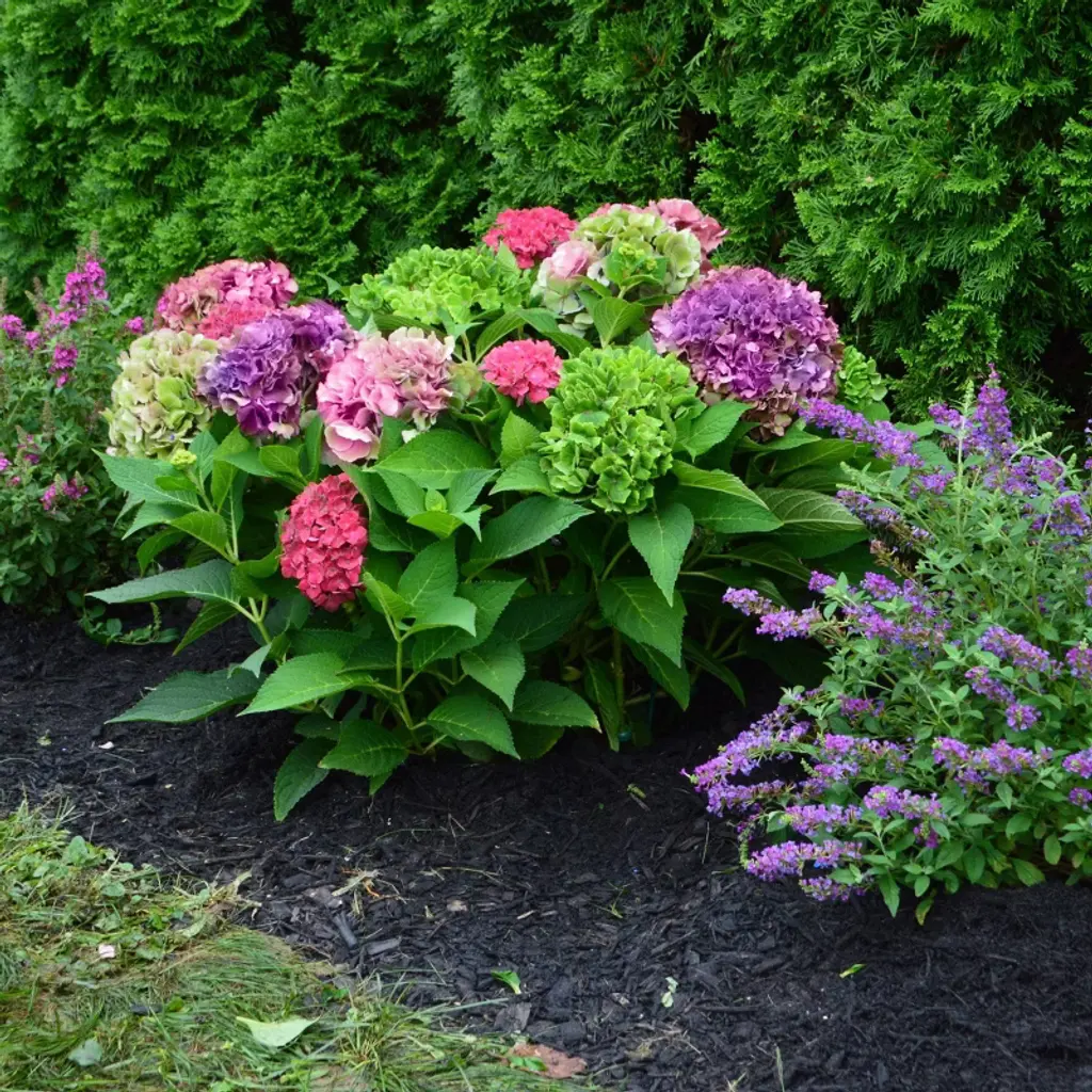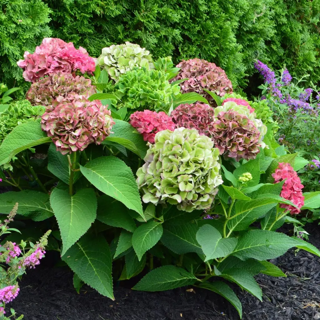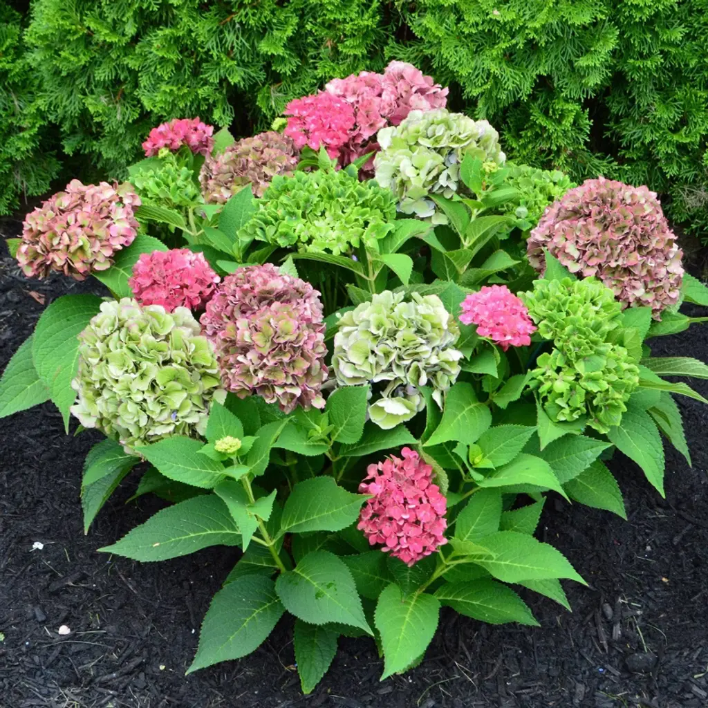 Lime Lovebird produces massive, multi-colored blossoms that change from lime green to hot pink before ending with a beautiful shade of blue. Reblooming prolifically from summer to late fall, it provides continuous color in the landscape and an excellent source of cut flowers. Lime Lovebird is ideal for mass plantings in the landscape, foundation plantings, and even large containers on the patio.