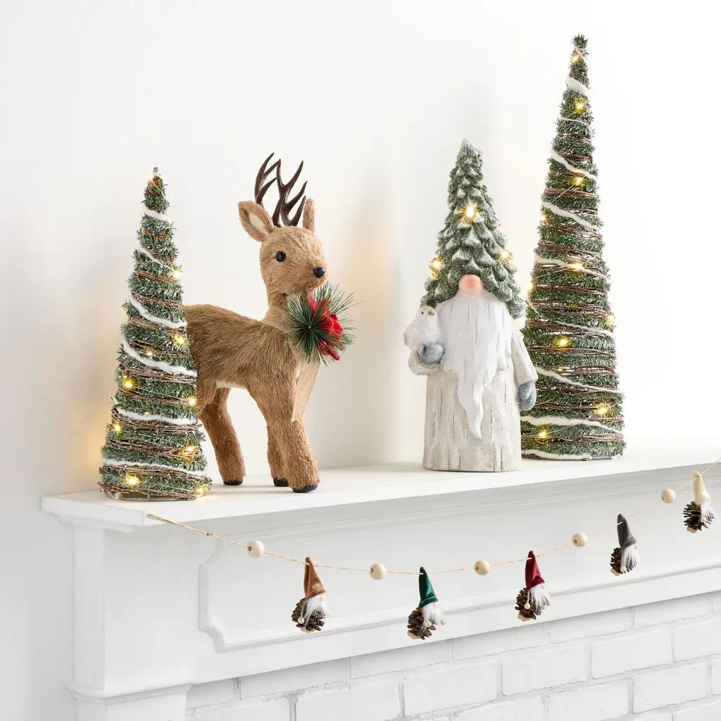 Our tall, textural deer decor is meticulously handcrafted from natural sisal fibers and adorned with a jute ribbon, faux greenery and a red wool poinsettia. Bright eyed and beautifully antlered, this sweetly posed accent lends woodsy charm to your holiday.