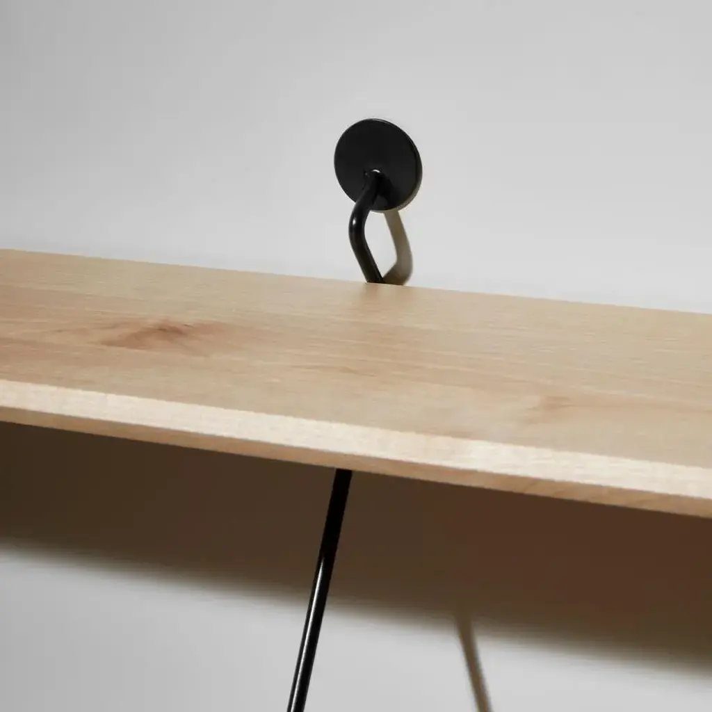 Natural Walnut "Climb" shelving system, Bashko Trybek Dimensions: 135 L x 27 W x 185 H cm Materials: Walnut Boards, Black Wires Different finishes, colors and sizes are available Climb is an ingenious shelving system made of beveled wooden boards supported by metal wires. The design plays with the sensation of tension of the wires that grasps the wooden shelves and becomes the structure. Climb is a system available in different dimensions, both for the home and the office. Climb comes in walnut or beech that can be combined with black, chrome, or colorful metal wires for either a sober and luxurious feel or a playful statement. Each wooden shelf is made and finished by hand. The boards receive a special mat varnish to preserve the natural feel of naked wood. Climb is an artisanal product and every wooden board has a different pattern for a rich and unique product. Bashko Trybek is a Polish designer. He created a graphic studio, Mundaka, and was artisitic directors for various magazines before he established his design studio in 2010. Bashko presents a playful and colorful design with smart and simple solutions.