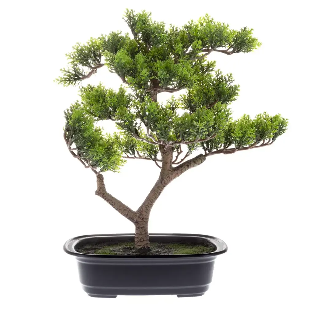 The 14.5-inch-tall Faux Pine Bonsai Tree by Nature Spring will brighten up any room with its lush greenery, exotic charm, and natural looking trunk, providing a realistic look that is hassle-free. The fake tree is made of high-quality plastic that offers lifelike detail and the vibrant coloring of live Bonsai trees. Set inside a durable ceramic planter with a black finish and a small footprint, this artificial tree can be displayed on a desktop, tabletop, or shelf. At 14.5-inches-tall, this pine Bonsai tree and its attractive container is sure to add beauty to any room in your home and make an ideal gift for housewarming parties, weddings, or holidays.