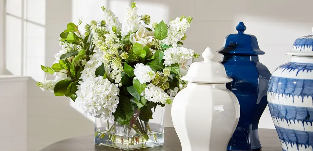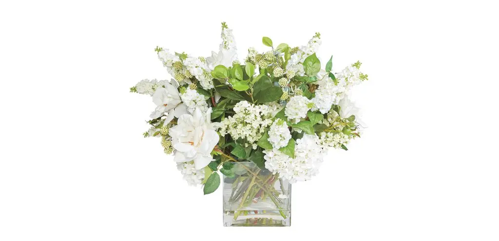 A white bouquet is eternally chic in any setting. This enduring arrangement captures the singular beauty of three distinctive flowers: the exquisite hydrangea, the showy snapdragon, and the universally loved rose. Its glossy green leaves add to its realism; the arresting arrangement is set in a simple, elegant clear glass vase.