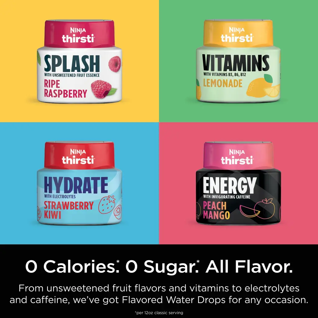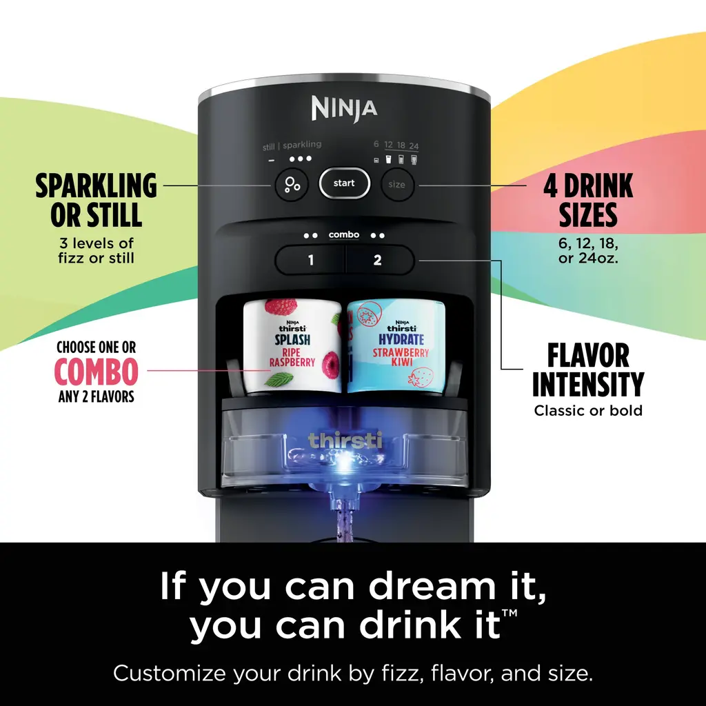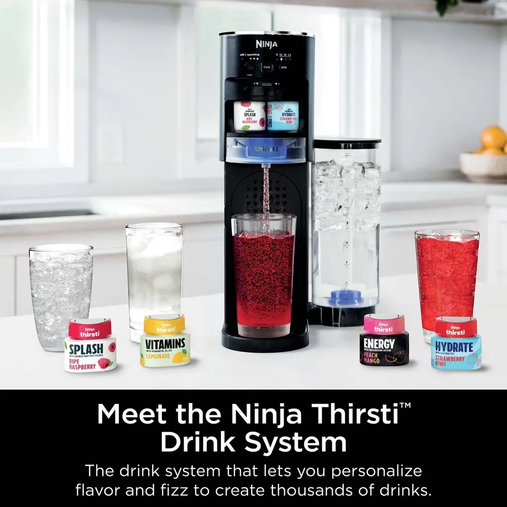 Meet the Ninja Thirsti Drink System. Create thousands of still and sparkling drinks at the touch of a button. Personalize your drink with 2 flavor strengths, 3 fizz levels, and 4 drink sizes. Dispense directly into your favorite cup, glass, or tumbler. Includes CO2 canister and a variety of Ninja Thirsti Flavored Water Drops. Enjoy a single flavor or combo two and create your signature drink.