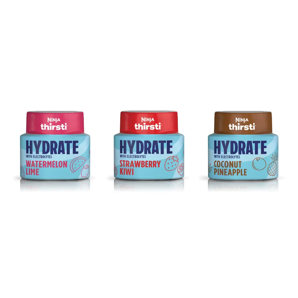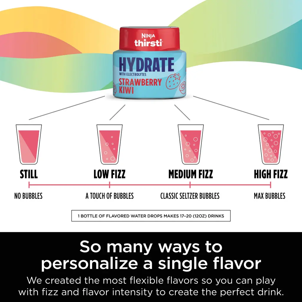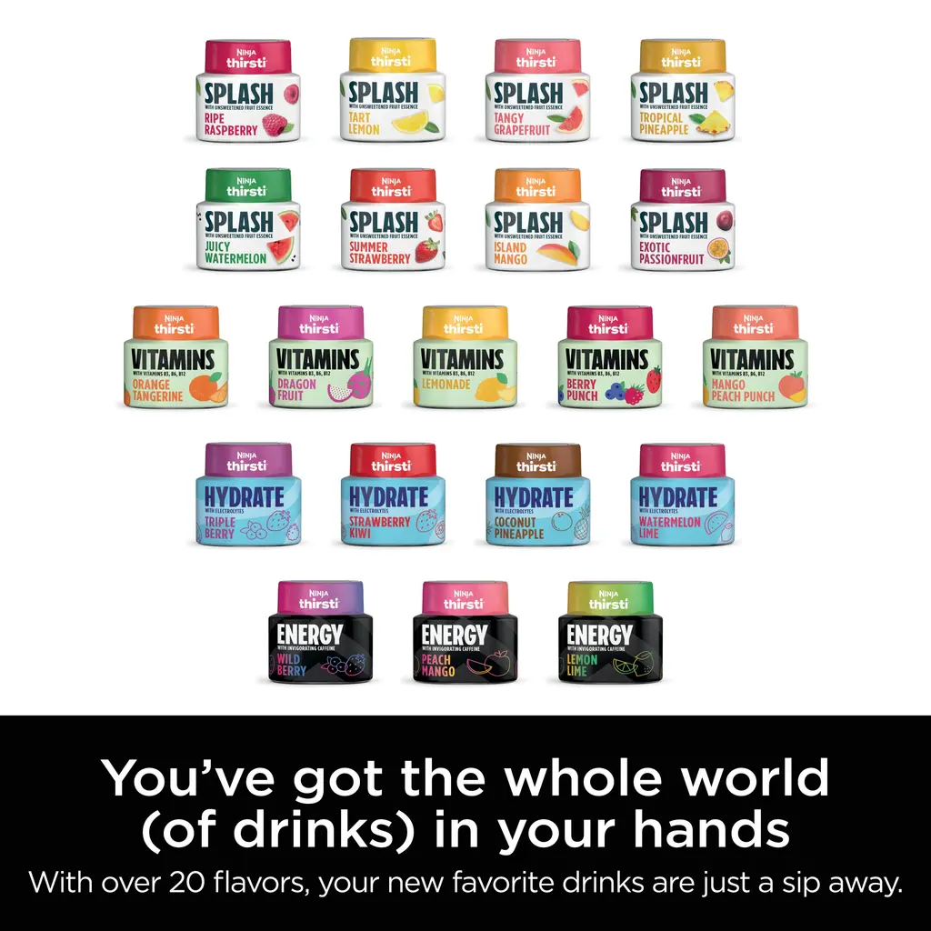 Meet the Ninja Thirsti Drink System. Create thousands of still and sparkling drinks at the touch of a button. Personalize your drink with 2 flavor strengths, 3 fizz levels, and 4 drink sizes. Dispense directly into your favorite cup, glass, or tumbler. Includes CO2 canister and a variety of Ninja Thirsti Flavored Water Drops. Enjoy a single flavor or combo two and create your signature drink.