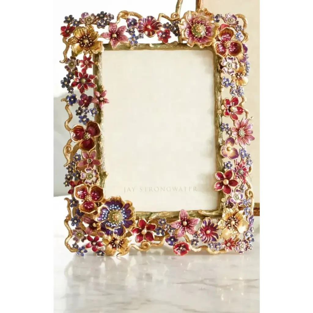 An exuberant bouquet of flowers strewn around the Ophelia frame, each one engraved with textures and hand-polished highlights. Casted in pewter, finished in 18K gold and beautifully painted in shades of magenta, plum and lilac enamels by our finest artisans in Rhode Island and sparkling with hand-set Swarovski crystals. With our signature, striped metal back plate and kickstand – this frame is truly beautiful from any view. Stands vertically or horizontally.