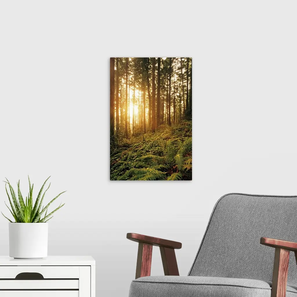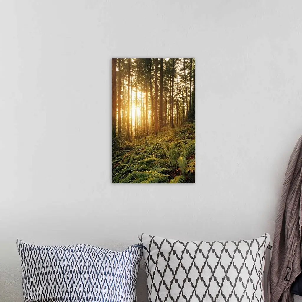 Oregon, Portland, Wildwood Trail, Sunlight Shining Through Fir Trees, Ferns, And Ivy wall art for home and office decor. Discover canvas art prints, photos, mural, big canvas art and framed wall art in GreatBigCanvas.com's varied collections.