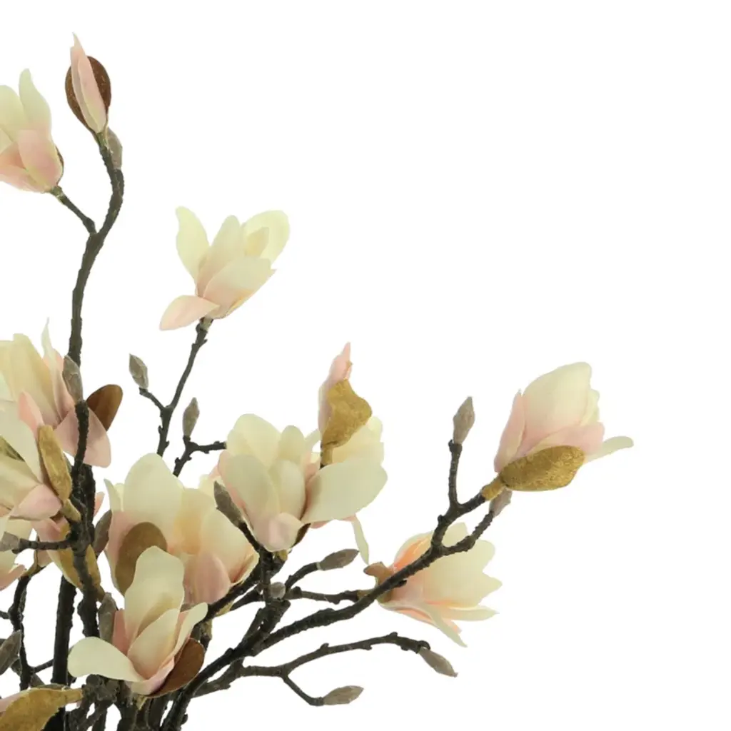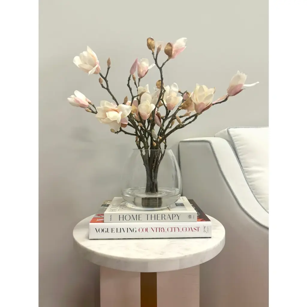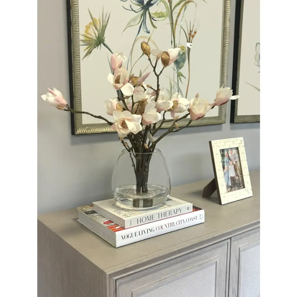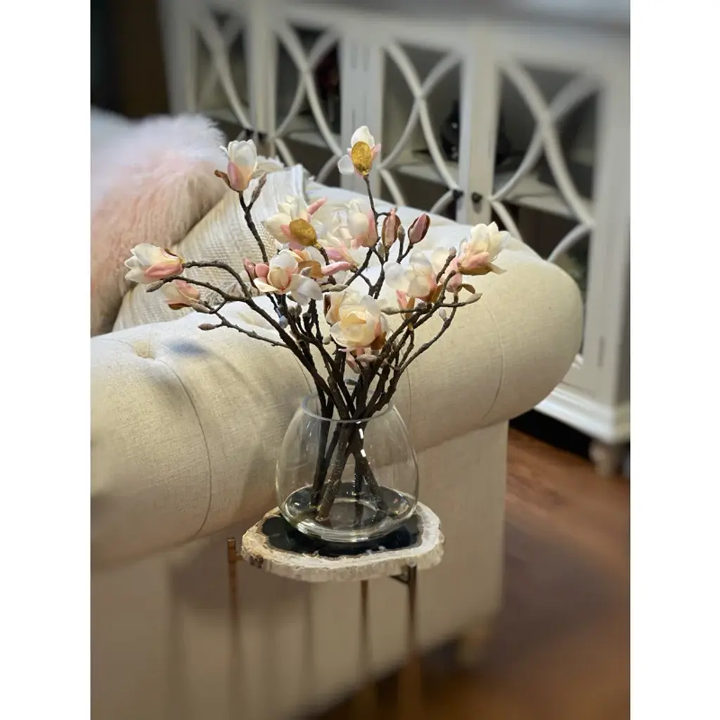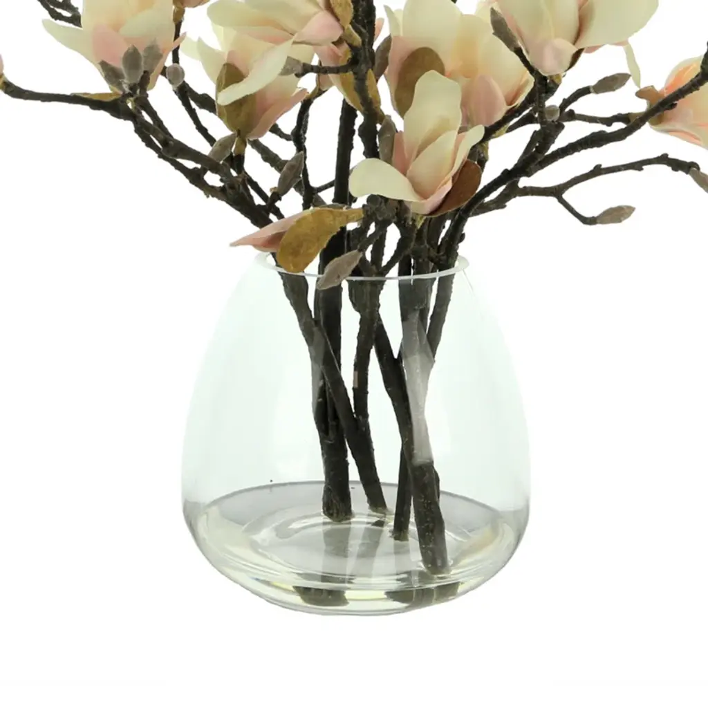 Bring the beauty of nature to the comfort of your own home. Featuring an elegantly crafted butterfly magnolia branch floral arrangement in a clear glass vase with acrylic water. Our faux floral will bring you the joy and beauty of the outdoors without any watering necessary.
