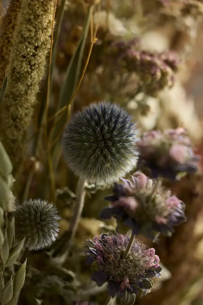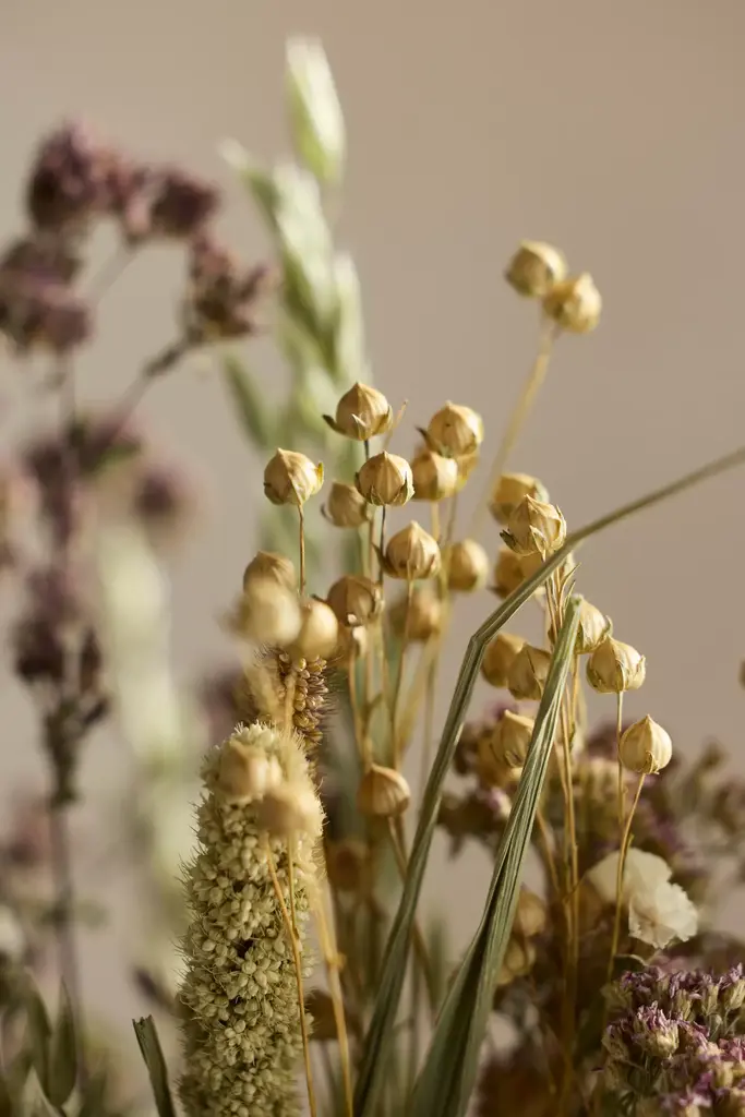Hand-crafted by a woman-led team in Washington state, this organic, naturally-preserved bouquet is made up of grassy elements like quail brush twigs and broom corn, colorful textural speciments like purple oregano, mauve yarrow, and coral avena for a full, autumnal look.