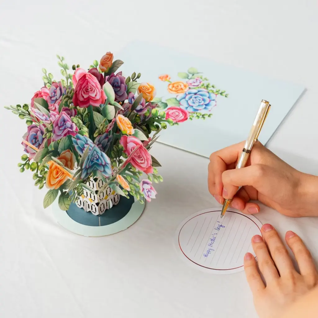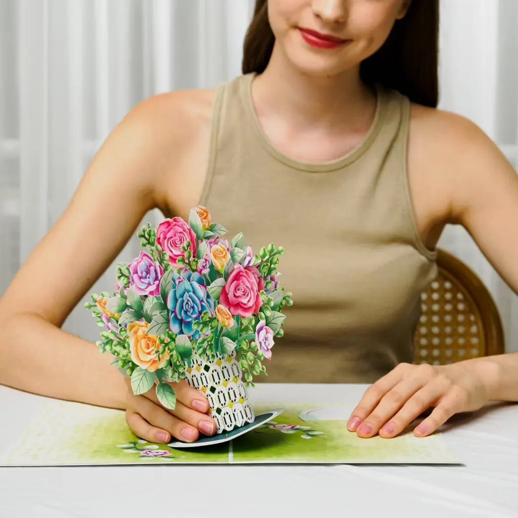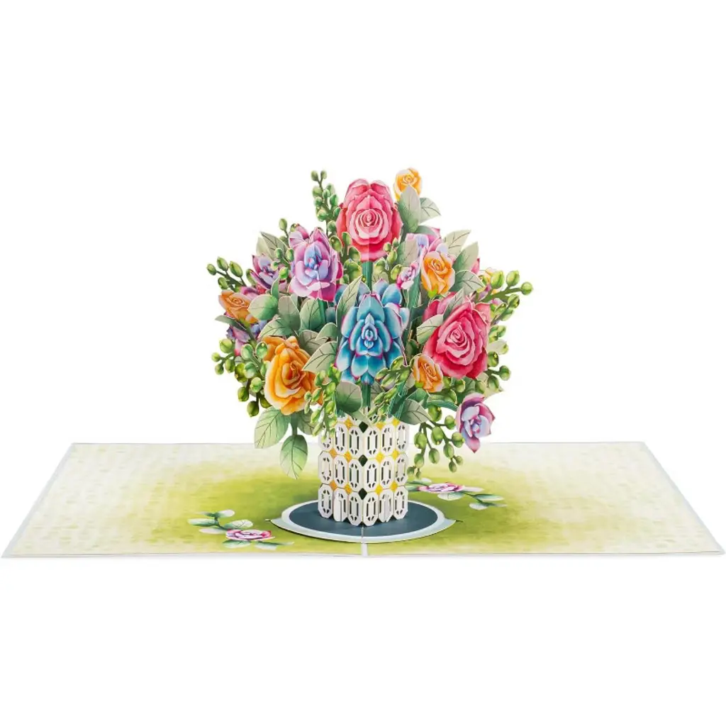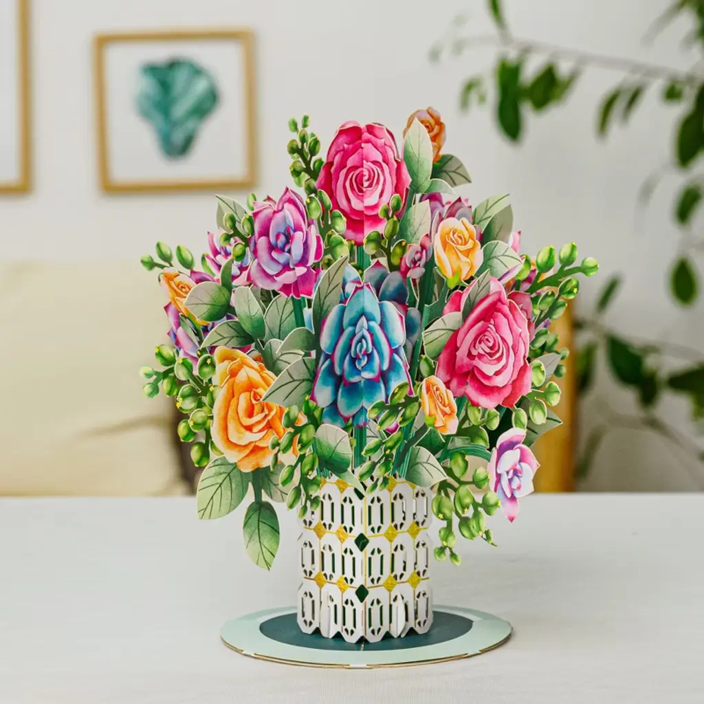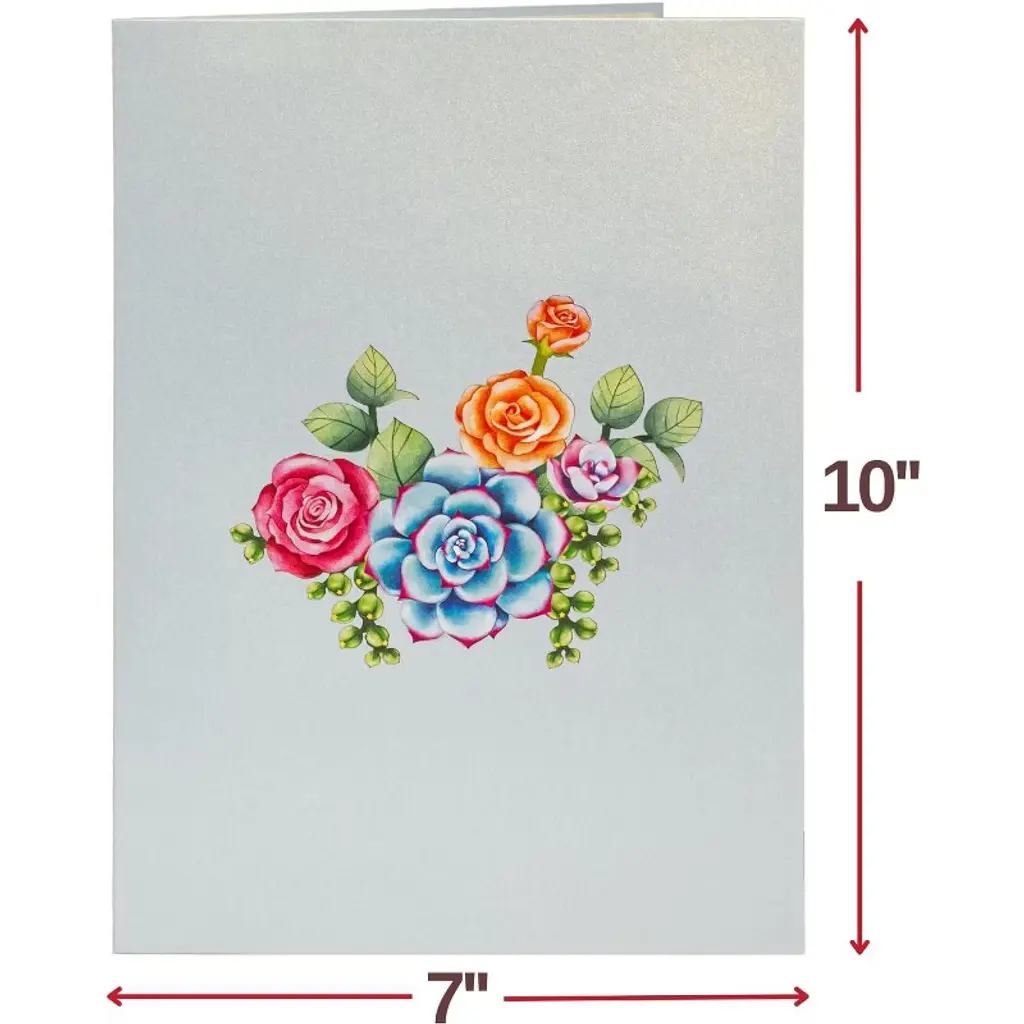 Celebrate every special moment with our charming Roses and Succulent Bouquet Pop-Up Card, a gift that lasts by highlighting the timeless beauty of roses and the enduring charm of succulents in exquisite paper art. Perfect for Mother’s Day, birthdays, anniversaries, weddings, thank-yous, get-well wishes, or just because, this keepsake card features intricate laser-cut details and romantic colors that express heartfelt affection and bring joy to anyone who receives it. Watch their delight as they open the oversized 10" x 7" card to reveal a detachable 3D pop-up bouquet—a beautiful surprise that adds an extra dimension to your message. Thoughtfully designed as a 2-in-1 masterpiece, it can be detached and displayed as stunning décor or treasured as a memorable greeting card, making every occasion romantic, meaningful, and truly unforgettable.