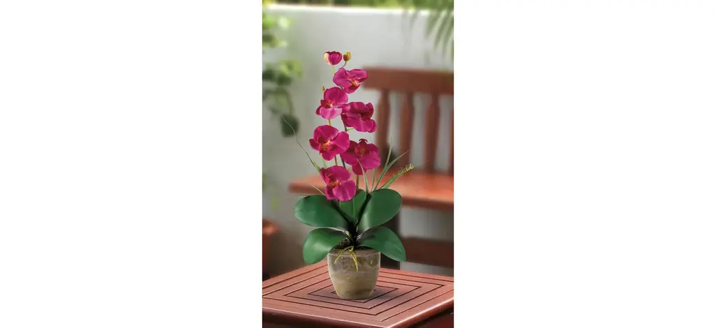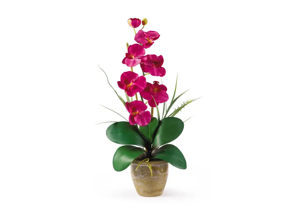 Bursting with color and personality the Phalaenopsis is perhaps the most popular variety of all the orchids as you can see in this Phalaenopsis Silk Orchid Flower Artificial Arrangement. Six lively blooms and two buds are complemented by genuine bamboo, which enhances the silk plant's authenticity. Featuring nearly natural leaves, moss and roots, this familiar favorite is sure to charm the masses.