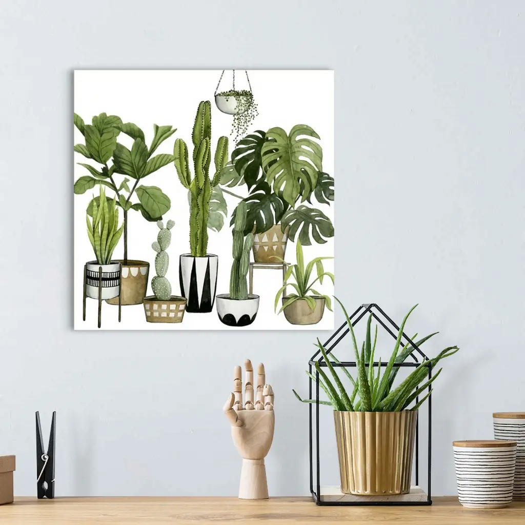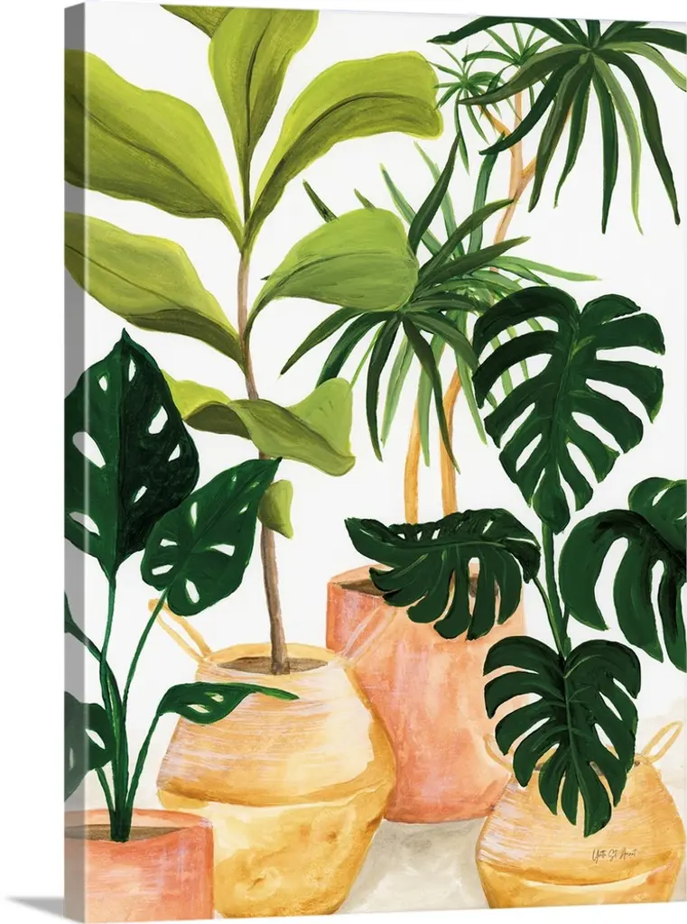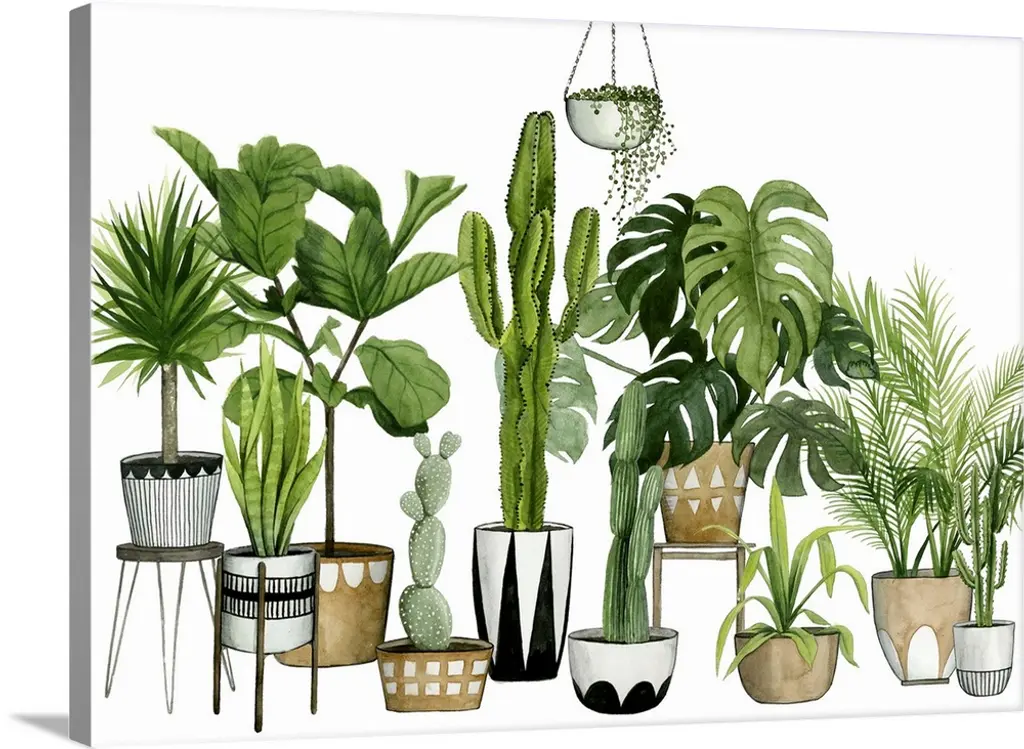 Illustration of a large collection of tropical plants and succulents, including palms and cacti.