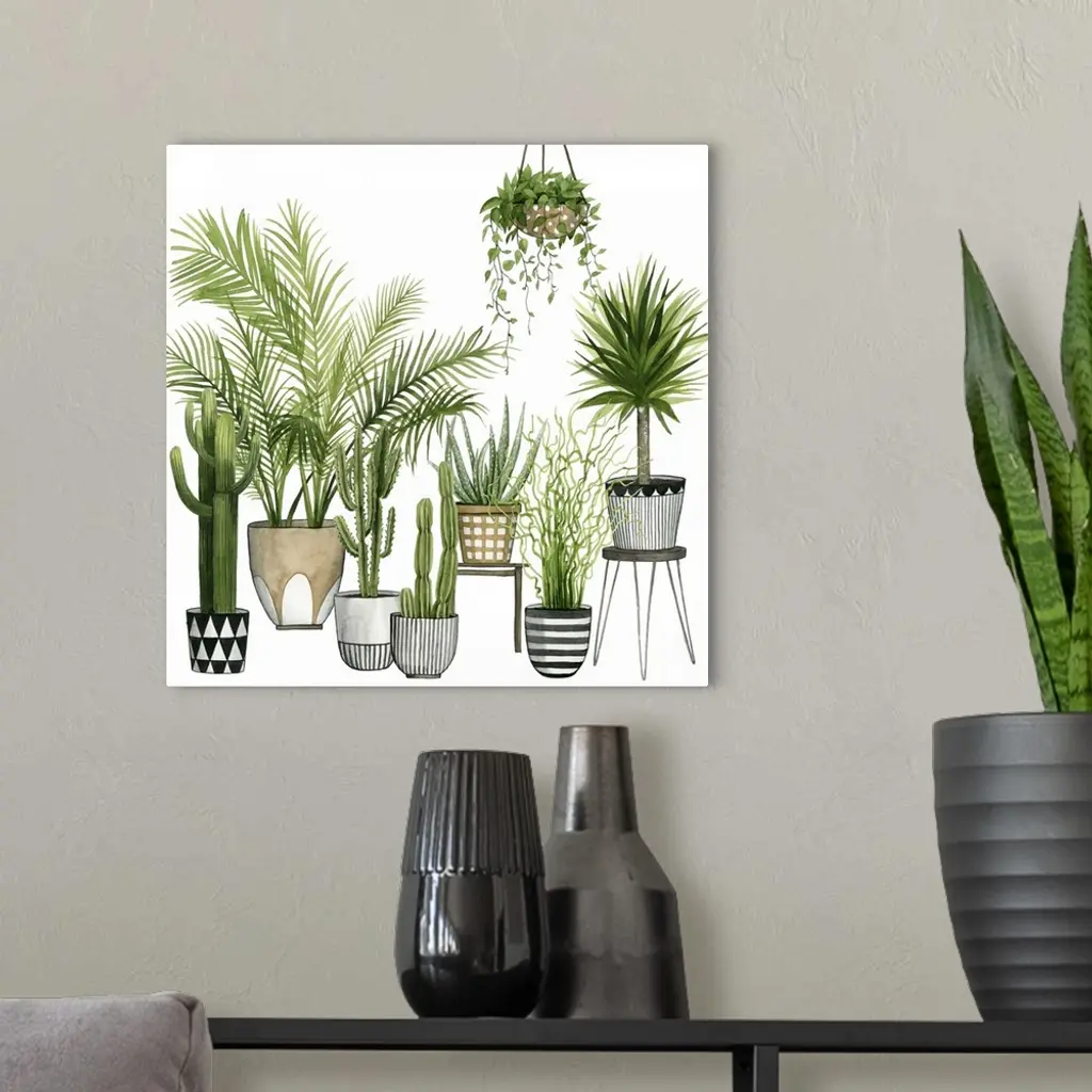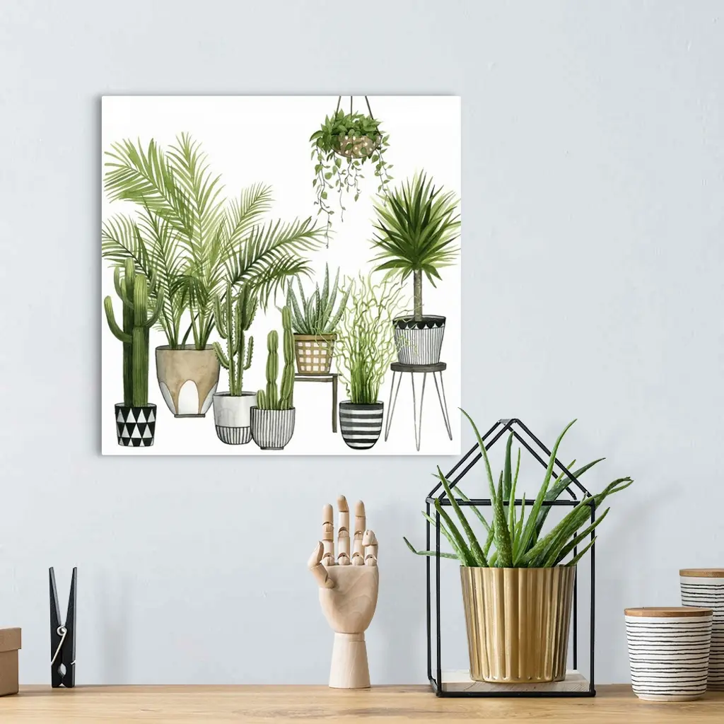 Illustration of a large collection of tropical plants and succulents, including palms and cacti.