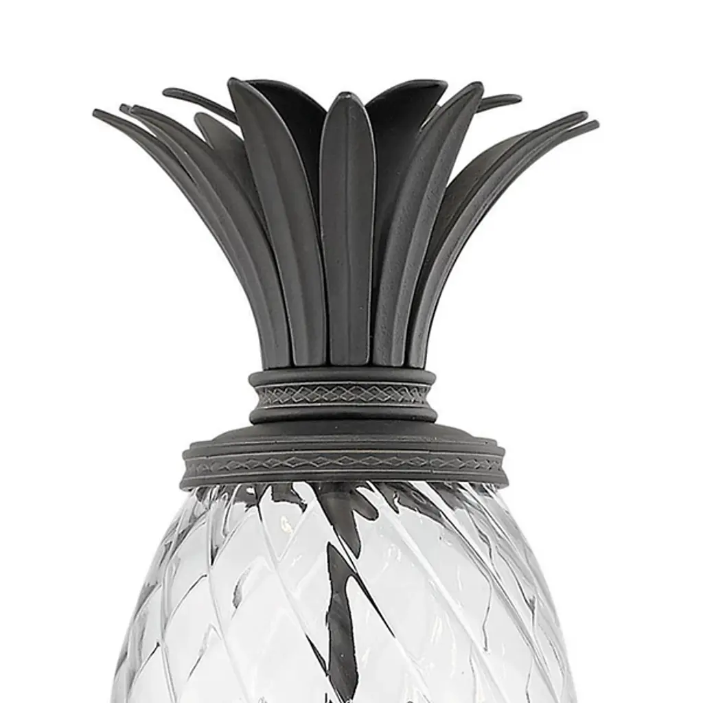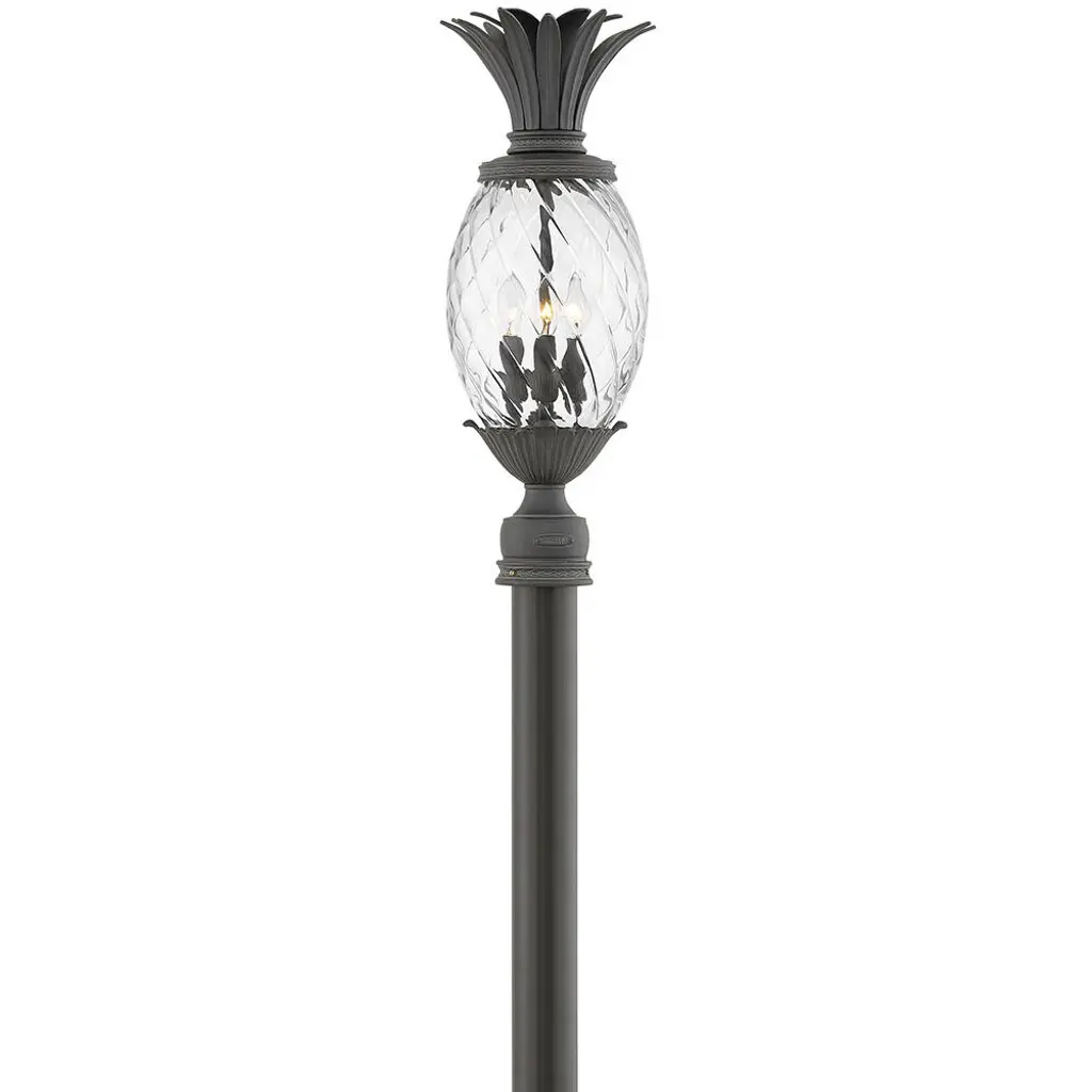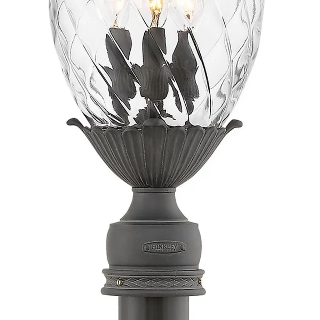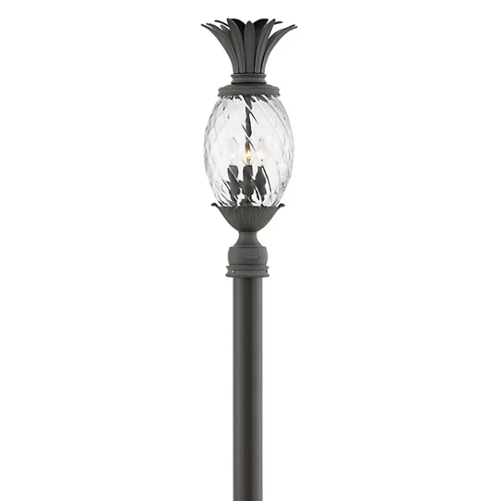 Plant a sweet addition to your outside lighting plan with the lively lines of the Plantation Post Light from Hinkley Lighting. A stately upswept fixture designed in the shape of a stylized pineapple, a wet-listed candelabra-style lamp sits inside an oval shade of clear optic glass subdivided to resemble the fruit’s surface. Flaring, cast aluminum leaves fly out from above and below to accent the lamping’s gentled glow, offering a matte counterpoint to the sleek glasswork. The post, as it happens, is sold separately.