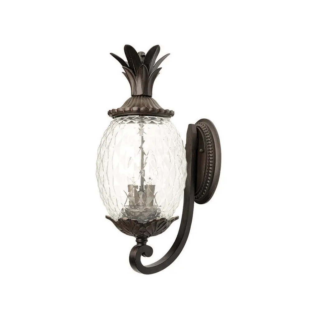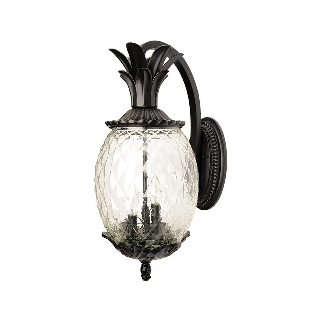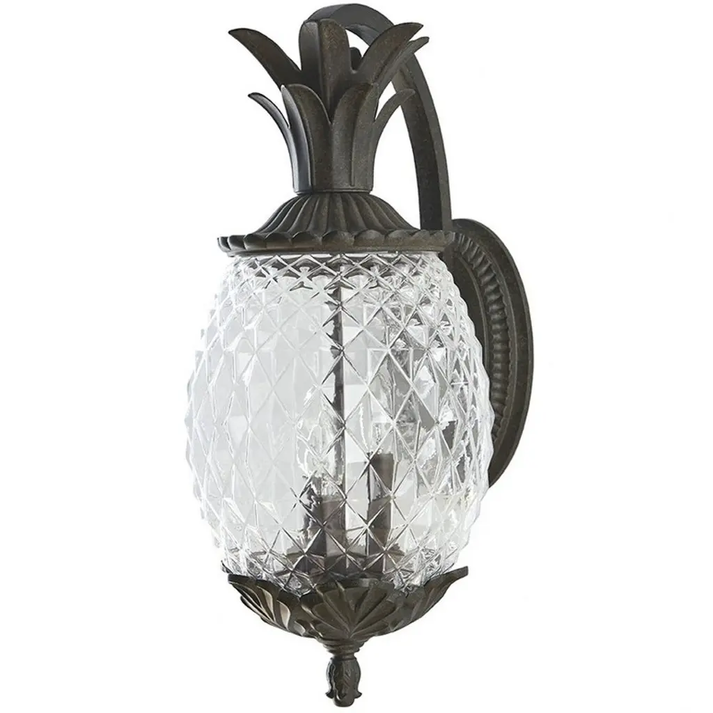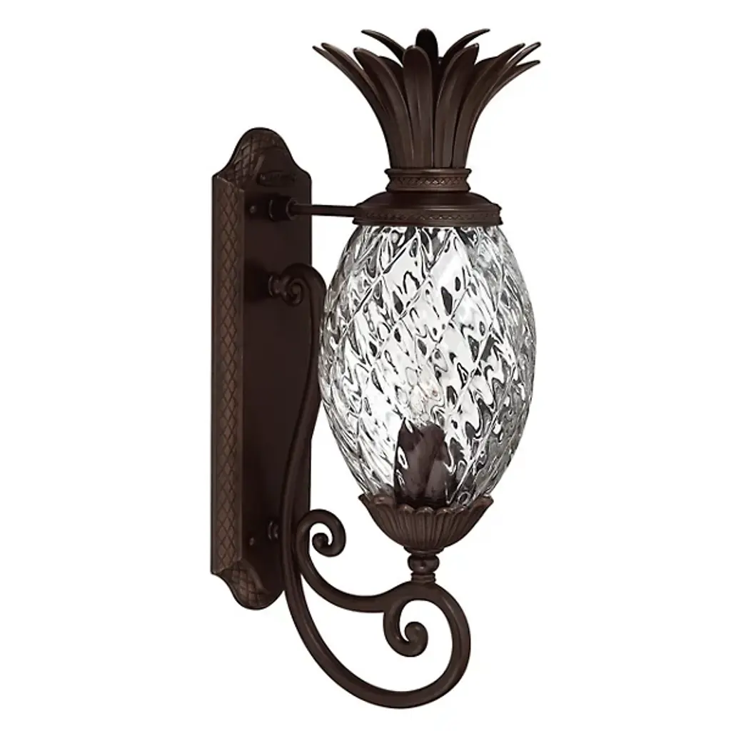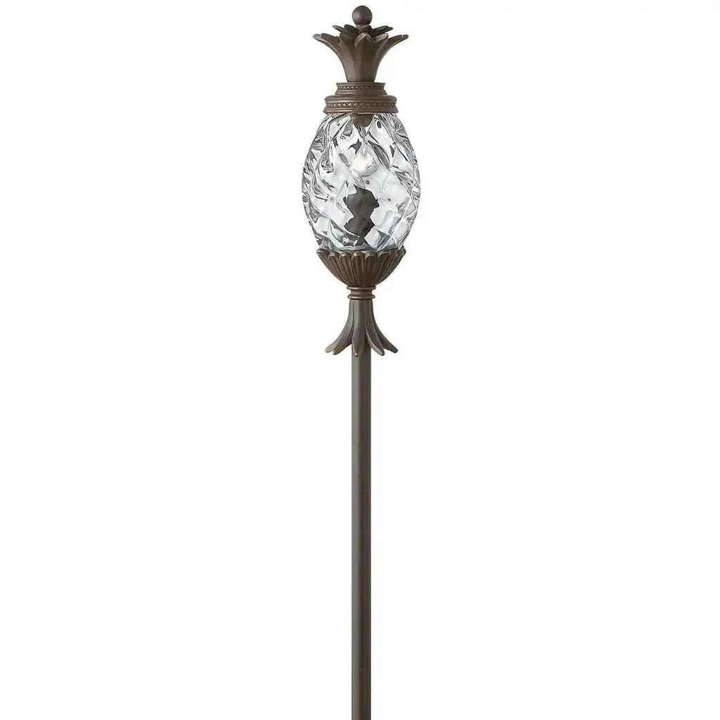 Plant a sweet addition to your outside lighting plan with the lively lines of the Plantation Post Light from Hinkley Lighting. A stately upswept fixture designed in the shape of a stylized pineapple, a wet-listed candelabra-style lamp sits inside an oval shade of clear optic glass subdivided to resemble the fruit’s surface. Flaring, cast aluminum leaves fly out from above and below to accent the lamping’s gentled glow, offering a matte counterpoint to the sleek glasswork. The post, as it happens, is sold separately.