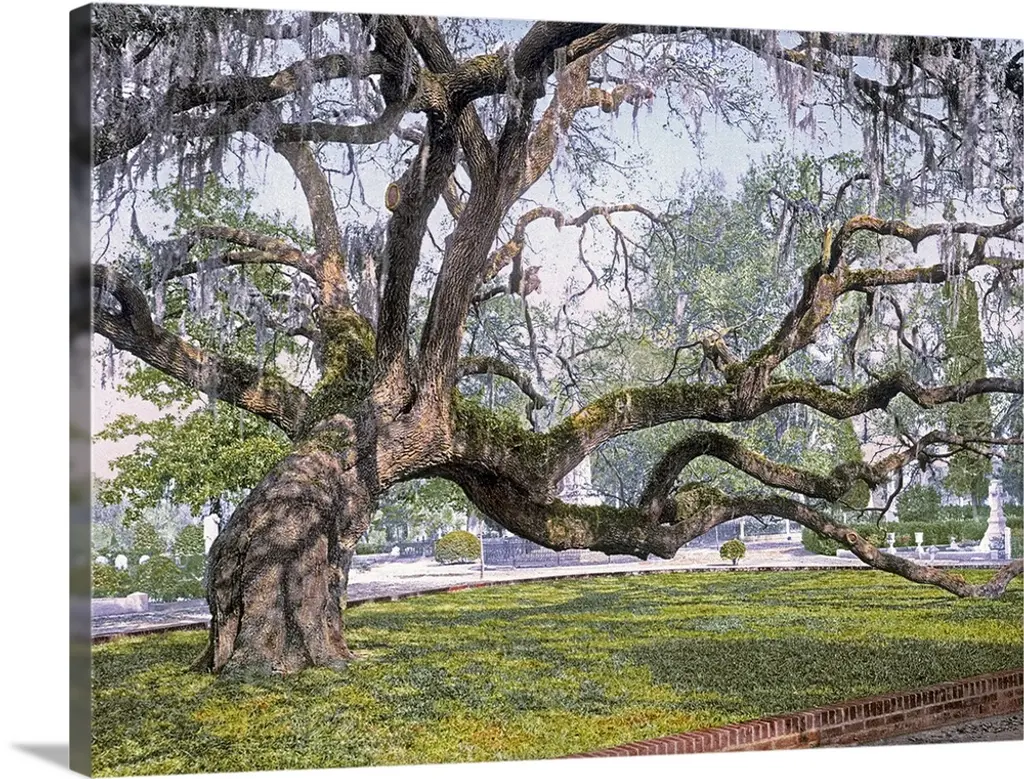 Black and white photography of a tall oak tree with large branches in a shady forest.