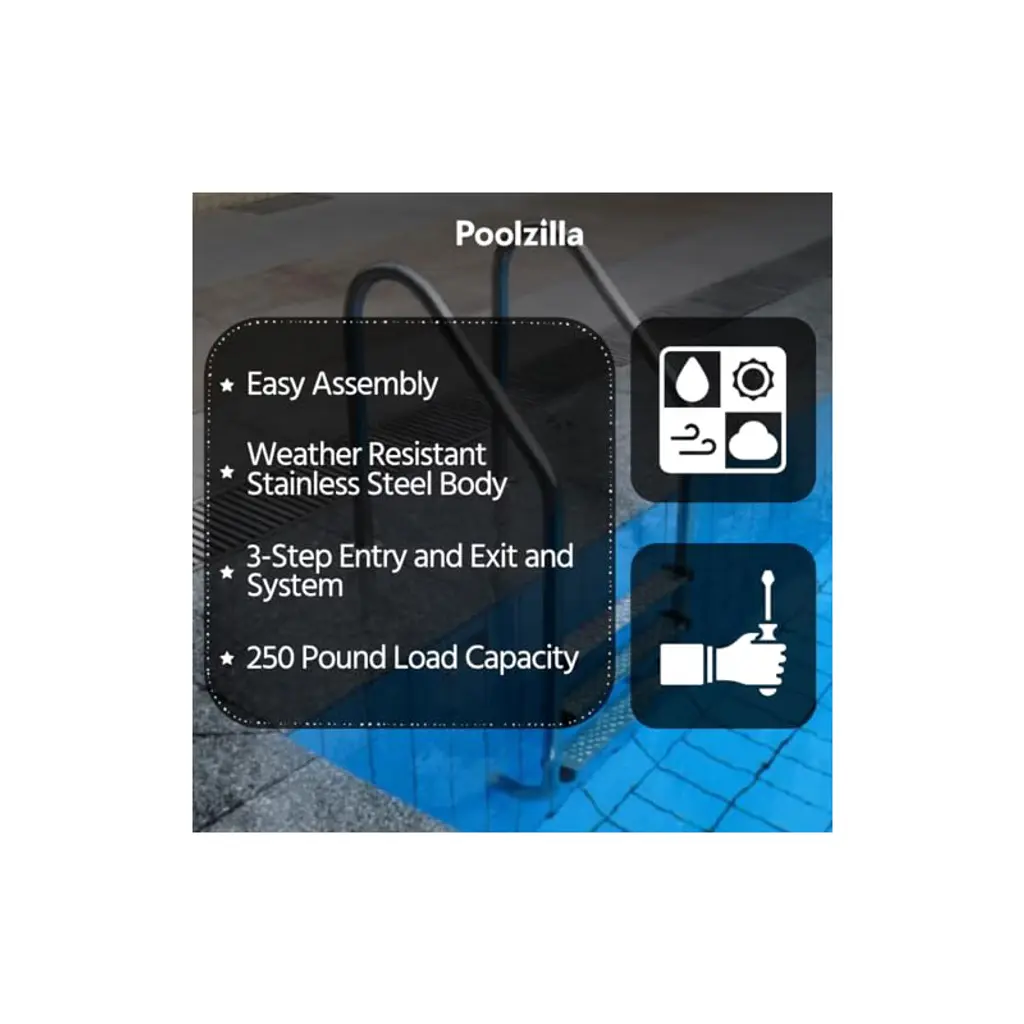 Poolzilla Three Tread Salt Ladder - Deck Mounted Stainless Steel Entry and Exit System, with Pre-Drilled Flange-Style End and Stainless Steel Steps | 04-01-001-1 Features and Benefits:【💧】Crafted from salt-safe materials, this ladder features three perforated stainless steel steps for easy entry and exit, with dual stainless steel handrails for added safety. All necessary step hardware is included.【💧】Designed to mount directly onto your deck using a pre-drilled flange-style base. Secure it to the pool deck easily with the adhered anchor flanges—simply align the three pre-drilled holes and fasten with bolts (not included).【💧】A pre-attached escutcheon plate and easy-to-install rubber bumpers provide a finished appearance while protecting your pool wall from wear caused by ladder contact. At the end of the season, the ladder can be quickly removed for convenient off-season storage.【💧】Designed with saltwater pools in mind, this ladder ensures long-lasting durability even in harsh environments, while remaining suitable for use in other types of pools or spas. Note: Not intended for use with inflatable or soft-sided pools.【💧】 Poolzilla cares deeply about the integrity of our products. With a shopping experience fully backed by our Quality Control, Customer Service, and Technical Support Teams, located in New Jersey.