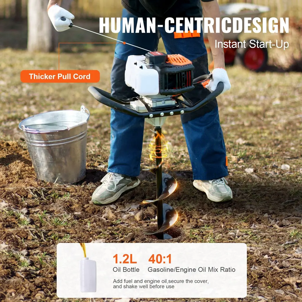 Powerful Power: Equipped with 63cc displacement fuel engine, power is up to 2400W, rotational speed is up to 8500rpm, and rotational speed of the drill bit is up to 32rpm. It can easily deal with all kinds of soil and terrain conditions, which is suitable for the demand of heavy-duty work. For 52CC 1450W option: Equipped with 52cc displacement fuel engine, the power is up to 1450W, the rotational speed can reach 9500rpm, and the drill bit rotates up to 32rpm Durable Material: The drill bit is made of alloy steel with powder coated metal surface, strong corrosion and wear resistance, reducing maintenance and replacement frequency, we configure 8" drill bit and extension rod for you, convenient to use. Large engine cooling holes to keep the engine running for a long time. Quick Start: equipped with 1.2L large-capacity oil jug, you can just use the oil jug for proportioning, the gasoline engine oil mixing ratio is 40:1, the auger adopts a thickened pulling rope, which is more durable than the ordinary pulling rope, you can start the fuel auger in just 4 simple steps. Humanized Design: the ergonomically designed anti-vibration foam handle reduces the fatigue caused by long time use; the ergonomic butterfly handle provides maximum leverage and stability when working, and the emergency stop switch is enlarged at the handle, so that it can be turned off by hand. Multifunctional Applications: Equipped with a drill bit capable of deeper drilling operations to meet a variety of application scenarios, suitable for drilling holes for fence posts, setting mailboxes, building decks, planting a large number of trees, as well as many other lawn applications, shipped in unpackaged packages, and can be used immediately upon receipt of the product. Package Content Gas Post Hole Digger x 1 Instruction Manual x 1 Drill 8" x 1 Extension Rod x 1 Spark Plug x 1 Oil Can x 1 Socket Wrench x 1 Electricity Pen x 1 Allen Wrench x 4 Ties x 2