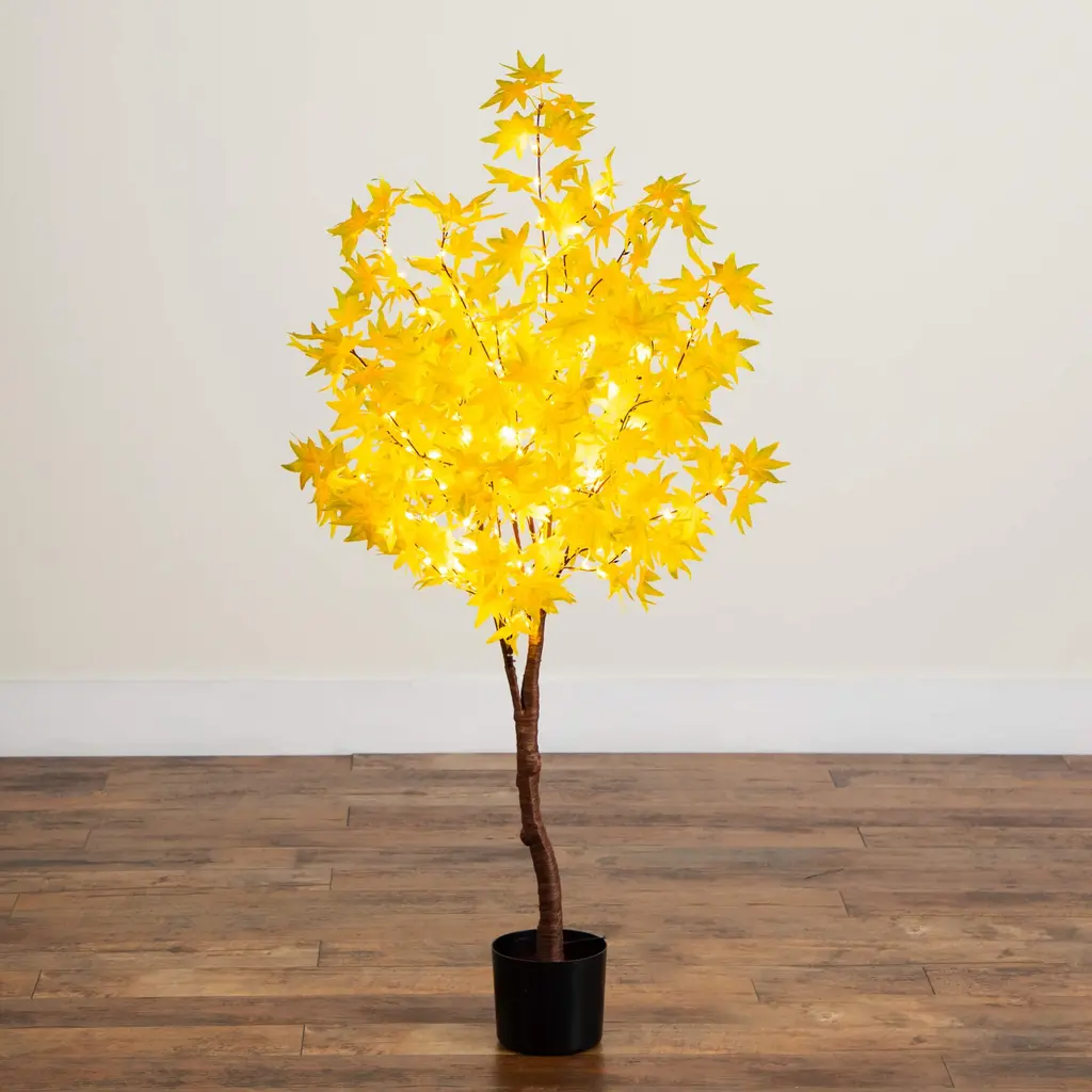 Bring the sunny, yellow colors of fall into your home with this yellow autumn maple artificial fall tree. Inspired by the bright, yellow hues of the season, you'll notice the attention to detail in every leave, as the ombre-like colors demonstrate maturing of the leaves. Crafted from high-quality materials, feel free to bend the branches. Nestled among the vivid colored leaves are 250 warm white LED lights, that create a cozy, moody display. Standing 5-Ft from a nursery pot, add your own planter for a custom look. Style in a living room, office or business.