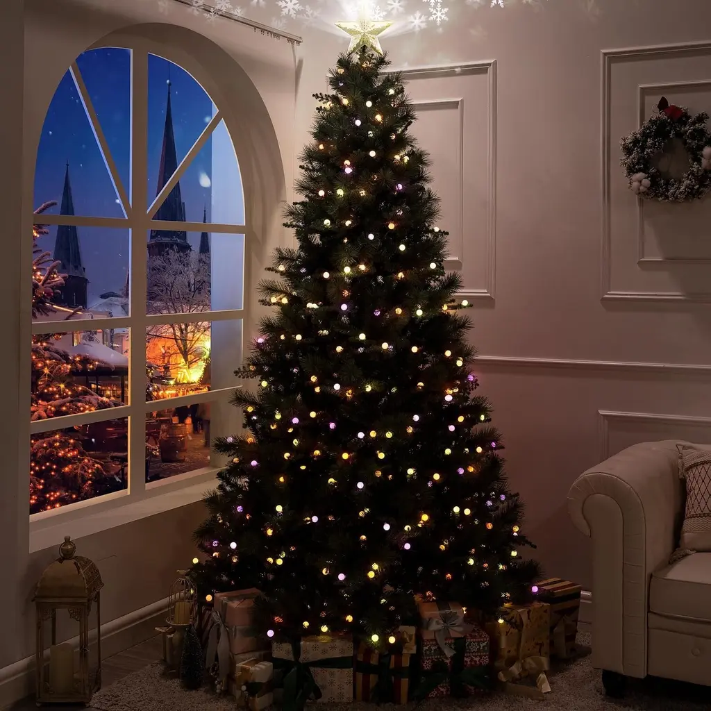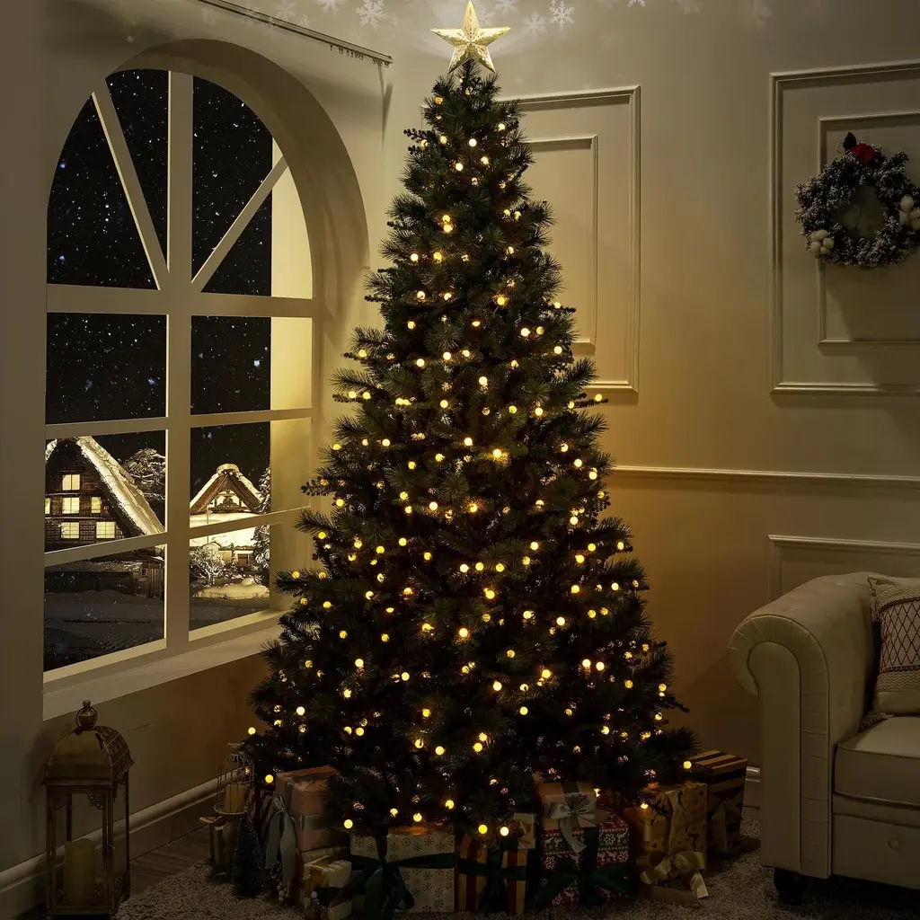 PERFECT FIT FOR ANY ROOM: Available in four sizes—4.5ft, 6.5ft, 7.5ft, and 9ft—these trees are designed to complement any space, from smaller apartments to large living rooms. The 4.5ft version fits snugly in cozy areas, while the 6.5ft, 7.5ft, and 9ft trees make a grand statement in larger rooms, adding festive charm and elegance to your holiday decor. REALISTIC FULLNESS & MAGICAL LIGHTING: Each tree boasts lifelike snow-dusted tips and soft global lights. The 4.5ft tree has 444 tips and 150 lights, the 6.5ft has 1,024 tips and 380 lights, the 7.5ft features 1,504 tips and 500 lights, and the grand 9ft version includes 2,514 tips and 850 lights. Topped with a star projector, each tree radiates a magical, starry glow to elevate your seasonal decor. WARM, INVITING GLOW: The global bulbs emit a soft, welcoming light that enhances your holiday decorations and creates a joyful, heartwarming ambiance. Whether it's the 4.5ft, 6.5ft, 7.5ft, or 9ft tree, the gentle illumination will set the perfect mood for your holiday gatherings and family traditions. BUILT TO LAST & SAFE FOR YOUR HOME: Constructed with premium PE and PVC materials, these trees are designed for durability and long-lasting use. Flame-retardant and non-allergenic, they provide peace of mind for families, while the sturdy metal stand ensures that each tree, no matter the size, stands tall and secure. EFFORTLESS ASSEMBLY & EASY STORAGE: Thanks to hinged branches, setup is quick and easy. Simply fluff the branches and start decorating! When the holiday season ends, the tree can be neatly folded for compact storage. The trees offer a hassle-free experience from setup to storage, making them perfect for year-after-year use. PEACE OF MIND WITH WARRANTY & SUPPORT: Each tree comes with a 90-day manufacturer’s warranty and responsive customer support, ensuring a smooth and enjoyable holiday experience. Whether you choose the compact 4.5ft, mid-sized 6.5ft, or grand 7.5ft or 9ft tree, you can rest assured that you're backed by reliable service for any assistance you may need.