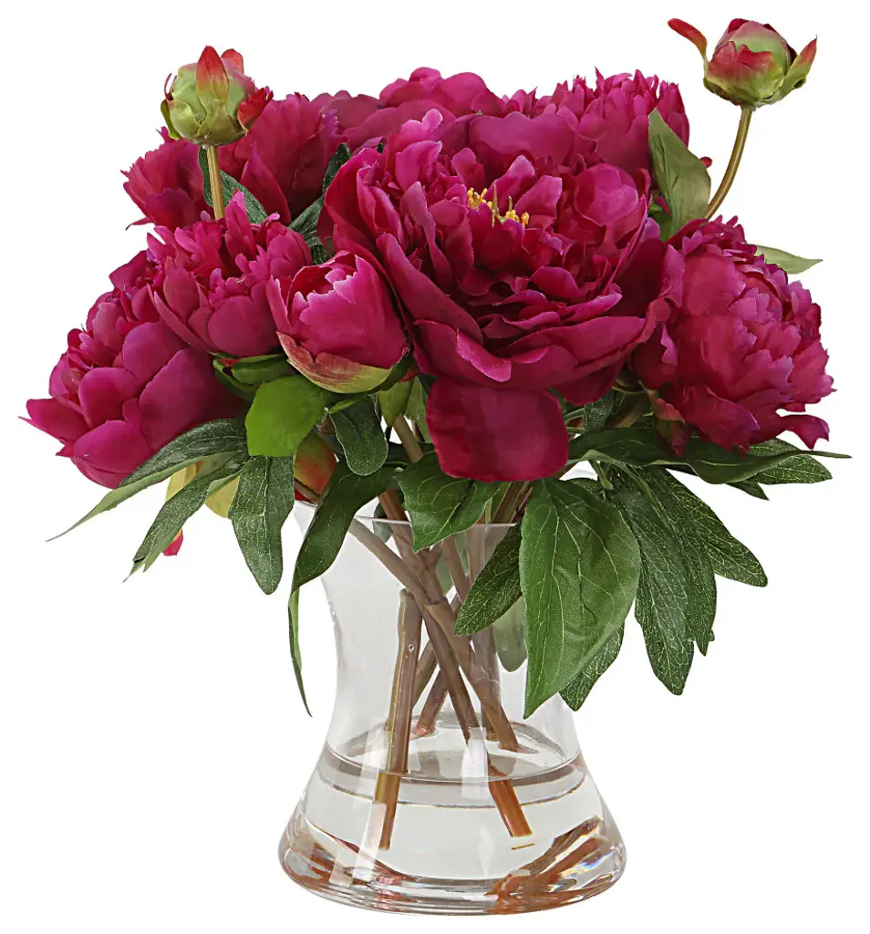 A vivid bunch of lush fuchsia peony cuttings placed in a fluted, clear glass vase with faux water.