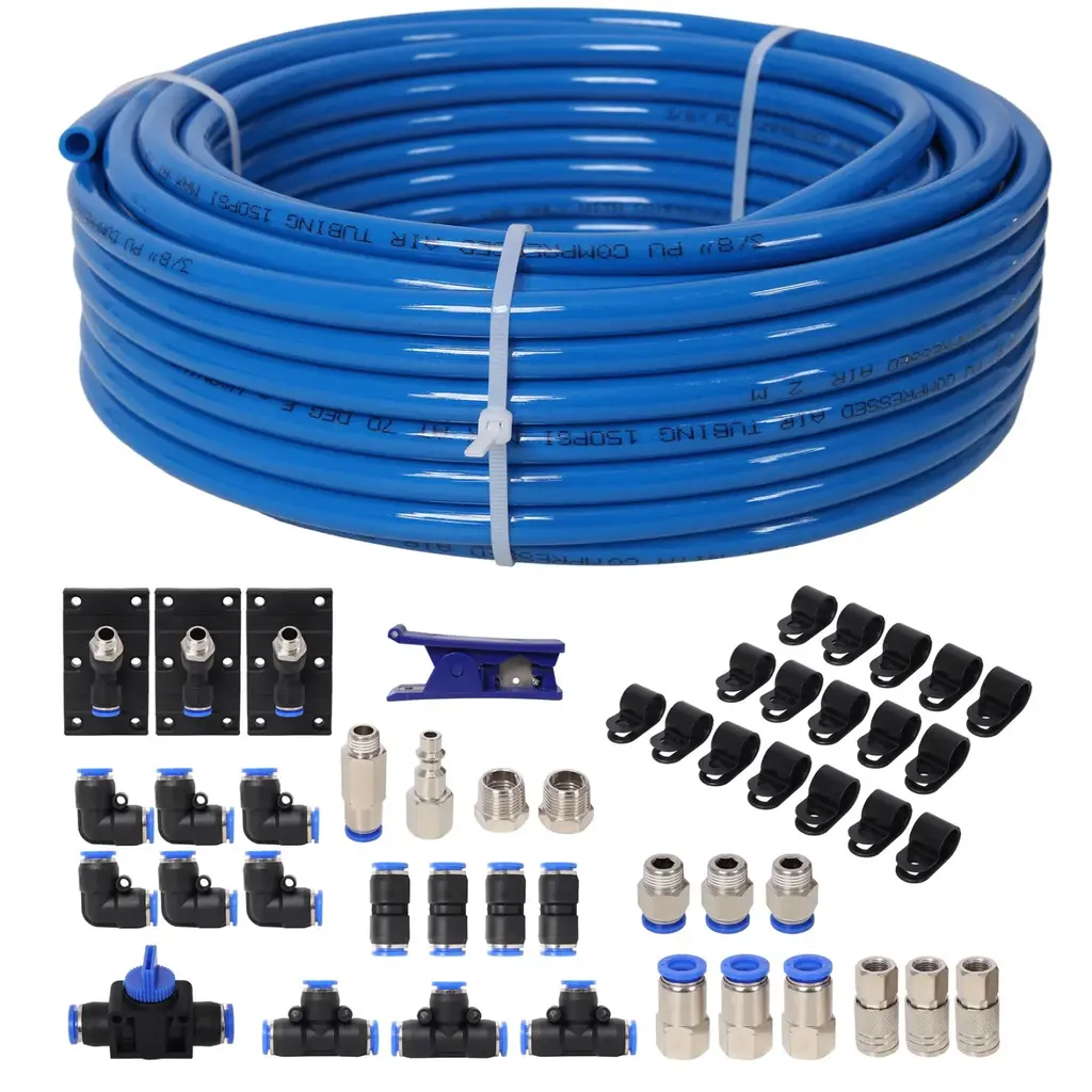 Upgrade your air system with this high-quality 3/8-inch x 60FT PU tubing kit. Designed for durability, the corrosion-resistant tubing ensures long-lasting performance, even in harsh environments. With a maximum working pressure of 200 PSI and an 800 PSI burst rating, this system provides reliable, high-pressure operation. The included cutting tool allows precise installation, while multiple fittings and connectors let you customize your setup with ease. Ideal for garages, workshops, and industrial applications, this kit eliminates the hassle of dragging compressors and air hoses. Enjoy a seamless, efficient, and professional-grade compressed air system for all your projects.Features:Specifications: