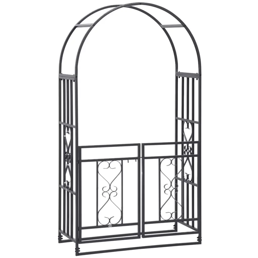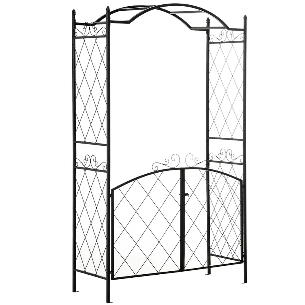 Measuring 49.25" L x 15" W x 89.25" H with a 48.5" W x 88.5" H entrance and 23.5" W x 33.75" H door panels, this arbor provides ample space. Assembly is required for setup. Resenkos Garden Arch Plant Support Trellis,89.25" Metal Garden Arch with Gate, Garden Arbor Trellis, Black