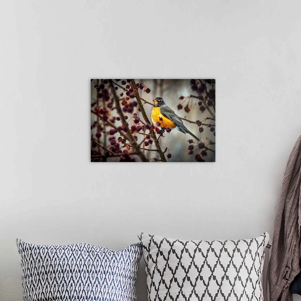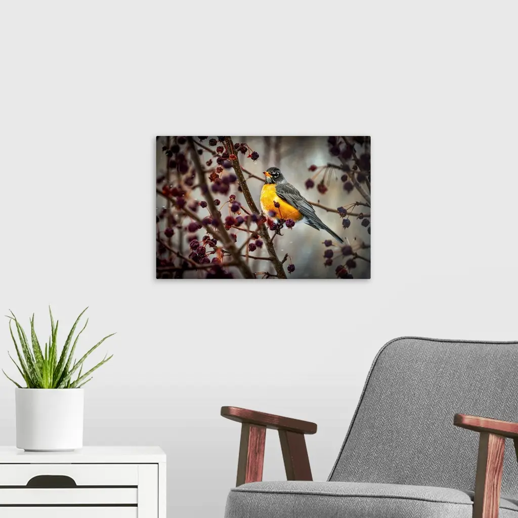 Robin sitting on an apple tree branch with dried small apples and snow flurries; Calgary, Alberta, Canada
