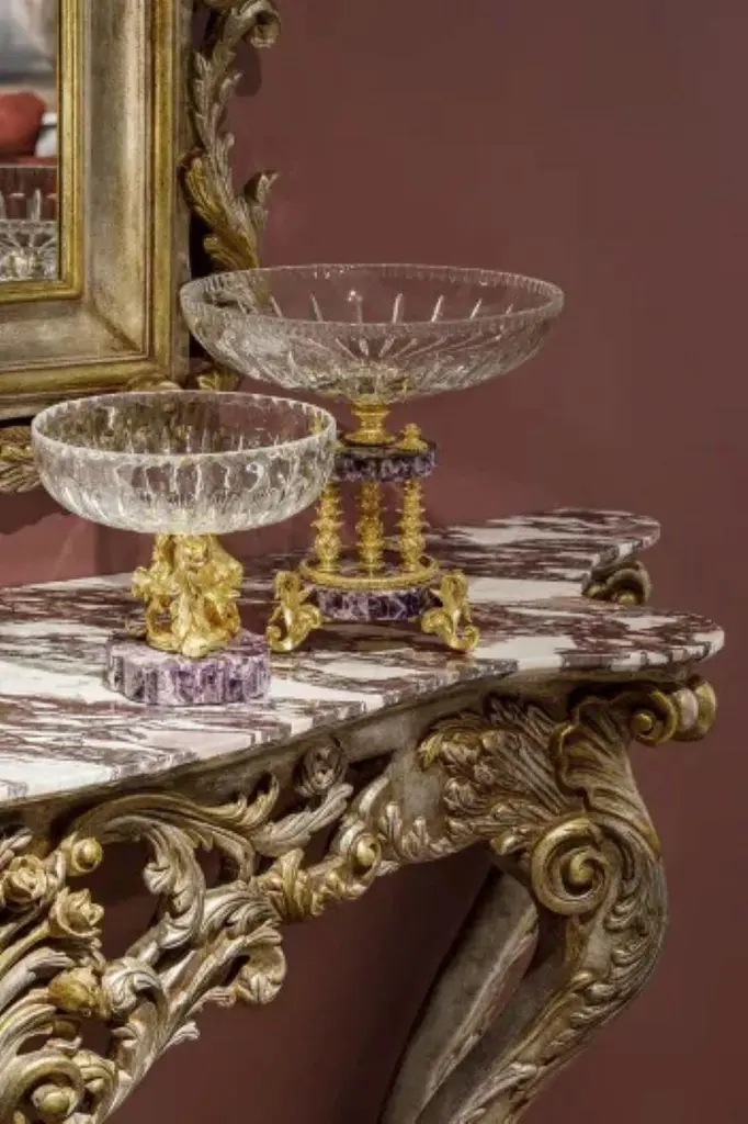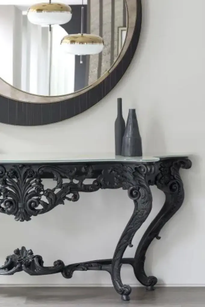 Every detail of this extraordinary console has been carefully designed to offer a unique piece of furniture, capable of lending a touch of sophistication and style to any environment. The 'Charlotte' console is perfectly suited to different types of furniture, from classic to contemporary.MaterialsAvailable in two finish variations: oxidised silver patina and black patina. Marble top