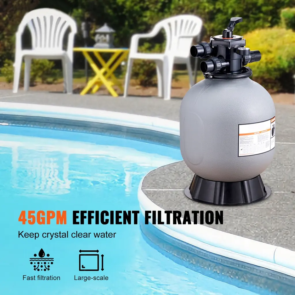 Your Pristine Pool Awaits: Tired of dealing with sand in your pool? The sand filter is here to help. With a max flow rate of 65 GPM / 45 GPM / 35 GPM, this filter can improve water cleanliness and ensure optimal filtration. Thanks to its ability to cycle an entire pool quickly, you can enjoy a safe and refreshing swimming experience free of sand and other contaminants. Built Tough Design: Our sand filter for inground pool is constructed from durable, corrosion-resistant polymer materials, ensuring long-lasting performance and extended service life. Designed to deliver reliable performance in any weather conditions, it's the efficient and cost-effective choice for your filtration needs. 7-Way Multi-Port Filter: With 7 different functions, maintenance has never been easier. Our in ground pool sand filter is designed with a range of modes, including filter, backwash, rinse, recirculate, waste, winter, and closed modes, giving you a variety of options to choose from. We recommend using 20# sand for optimal performance. Easy to Maintain & Install: The drain plug simplifies winter maintenance by allowing water to flow slowly through the pipes, avoiding freezing. The sand filter tank comes with threaded joints and 1-1/2" inlet/outlet fittings, making installation a breeze. Plus, a clear user manual provides step-by-step instructions to help you set up the filter in just minutes! Meet All Your Pool Needs: Our swimming pool sand filter is versatile and suitable for various above-ground and in-ground pools, including courtyard pools, indoor villa pools, gym pools, and hotel pools. Package Content 1 x Sand Filter 1 x Cylinder End Locking Ring (Right) 1 x Cylinder End Locking Ring (Left) 3 x Two-End Threaded Joints 1 x Single-End Threaded Joint 1 x Transparent Single-End T-Thread 1 x Pressure Gauge 2 x Screw Three-Piece Sets 1 x Teflon Tape 3 x Locking Nuts 2 x T-Joints 3 x O-Rings (58 x 3.1 mm) 3 x O-Rings (50 x 3.1 mm)