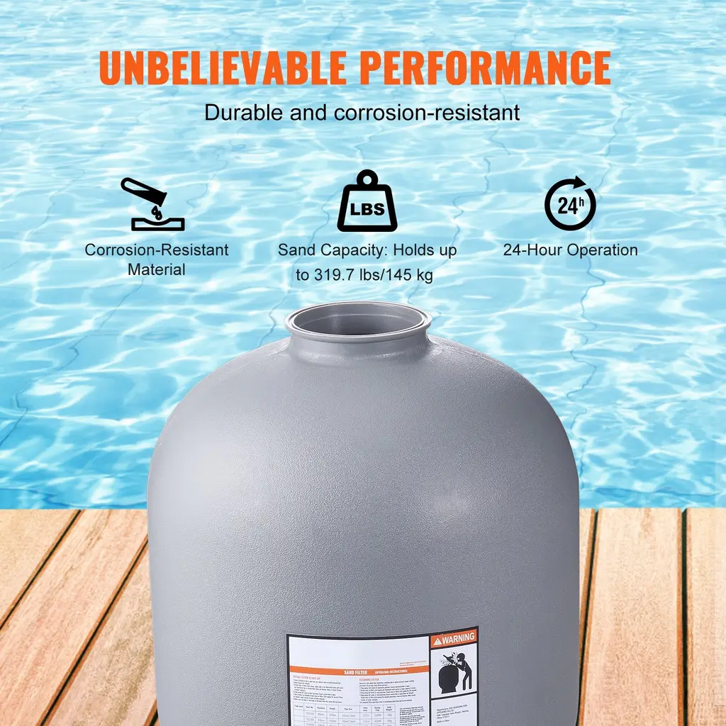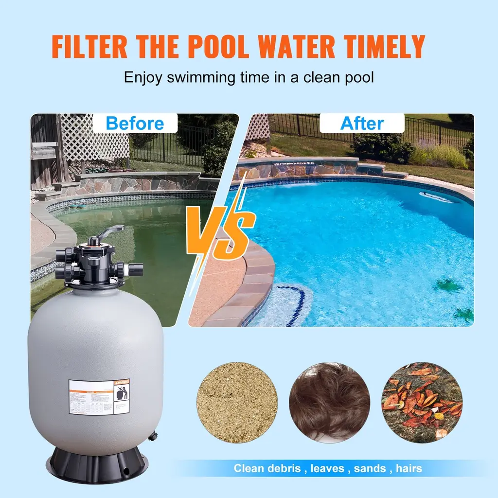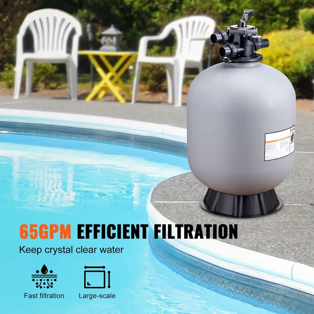 Your Pristine Pool Awaits: Tired of dealing with sand in your pool? The sand filter is here to help. With a max flow rate of 65 GPM / 45 GPM / 35 GPM, this filter can improve water cleanliness and ensure optimal filtration. Thanks to its ability to cycle an entire pool quickly, you can enjoy a safe and refreshing swimming experience free of sand and other contaminants. Built Tough Design: Our sand filter for inground pool is constructed from durable, corrosion-resistant polymer materials, ensuring long-lasting performance and extended service life. Designed to deliver reliable performance in any weather conditions, it's the efficient and cost-effective choice for your filtration needs. 7-Way Multi-Port Filter: With 7 different functions, maintenance has never been easier. Our in ground pool sand filter is designed with a range of modes, including filter, backwash, rinse, recirculate, waste, winter, and closed modes, giving you a variety of options to choose from. We recommend using 20# sand for optimal performance. Easy to Maintain & Install: The drain plug simplifies winter maintenance by allowing water to flow slowly through the pipes, avoiding freezing. The sand filter tank comes with threaded joints and 1-1/2" inlet/outlet fittings, making installation a breeze. Plus, a clear user manual provides step-by-step instructions to help you set up the filter in just minutes! Meet All Your Pool Needs: Our swimming pool sand filter is versatile and suitable for various above-ground and in-ground pools, including courtyard pools, indoor villa pools, gym pools, and hotel pools. Package Content 1 x Sand Filter 1 x Cylinder End Locking Ring (Right) 1 x Cylinder End Locking Ring (Left) 3 x Two-End Threaded Joints 1 x Single-End Threaded Joint 1 x Transparent Single-End T-Thread 1 x Pressure Gauge 2 x Screw Three-Piece Sets 1 x Teflon Tape 3 x Locking Nuts 2 x T-Joints 3 x O-Rings (58 x 3.1 mm) 3 x O-Rings (50 x 3.1 mm)