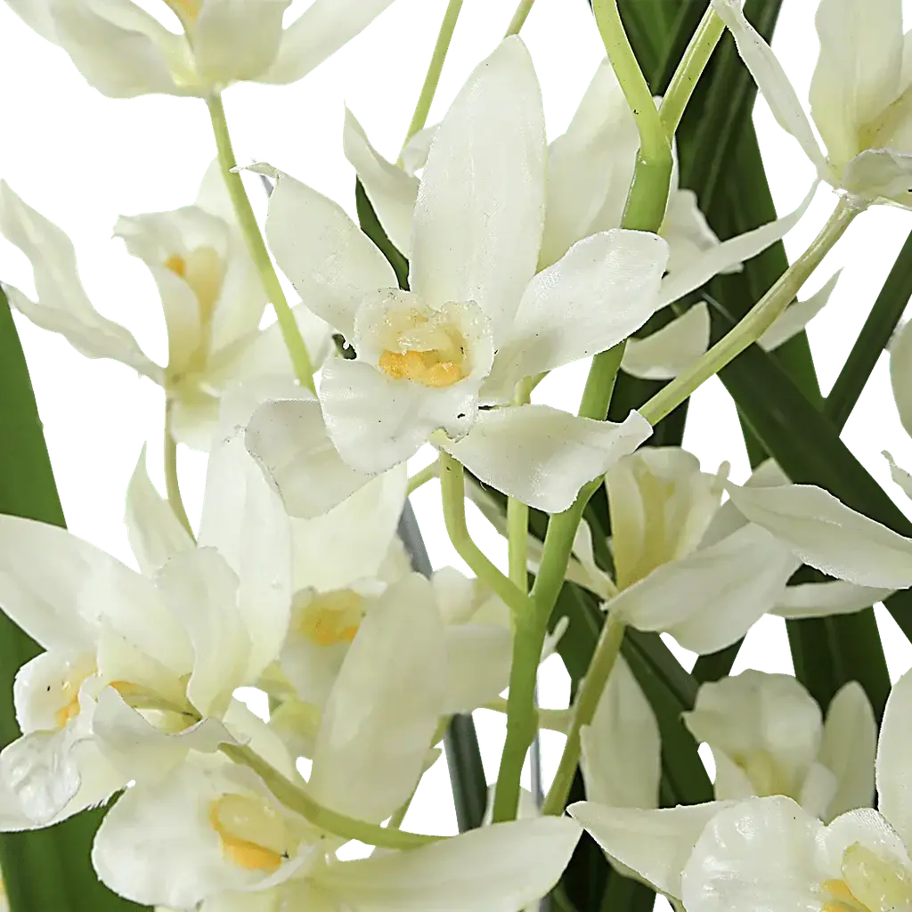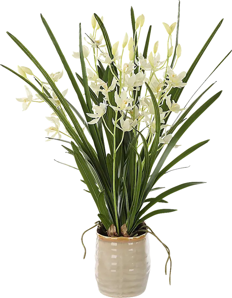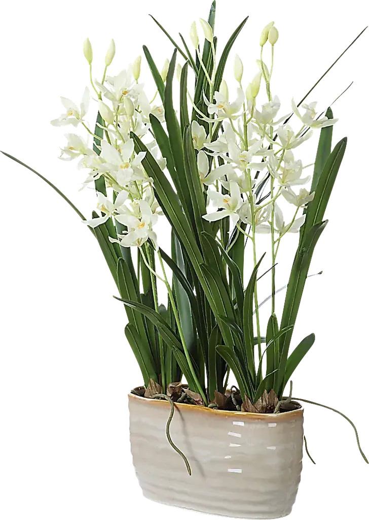 The Sanuria floral boasts sprigs of cream cymbidium orchids with lush green foliage are nestled into a textured, tan glazed ceramic planter with faux soil.