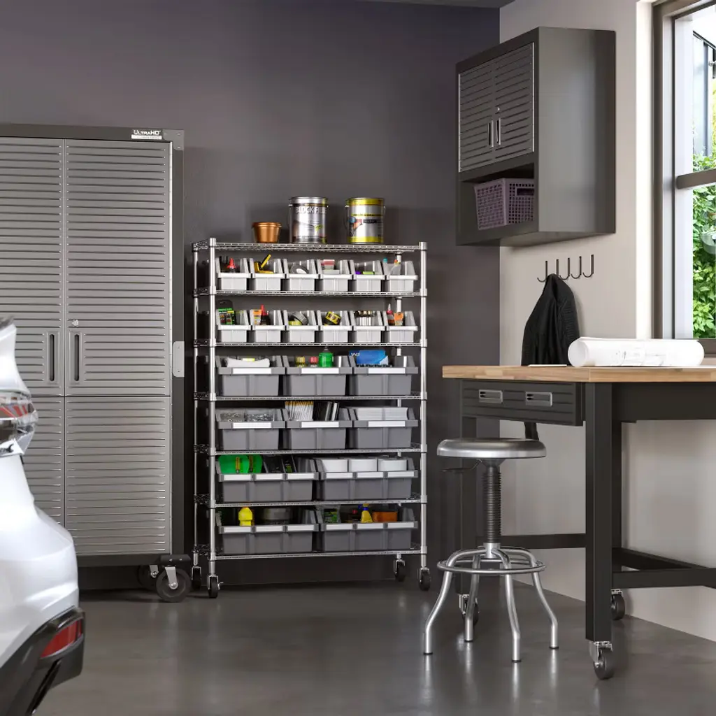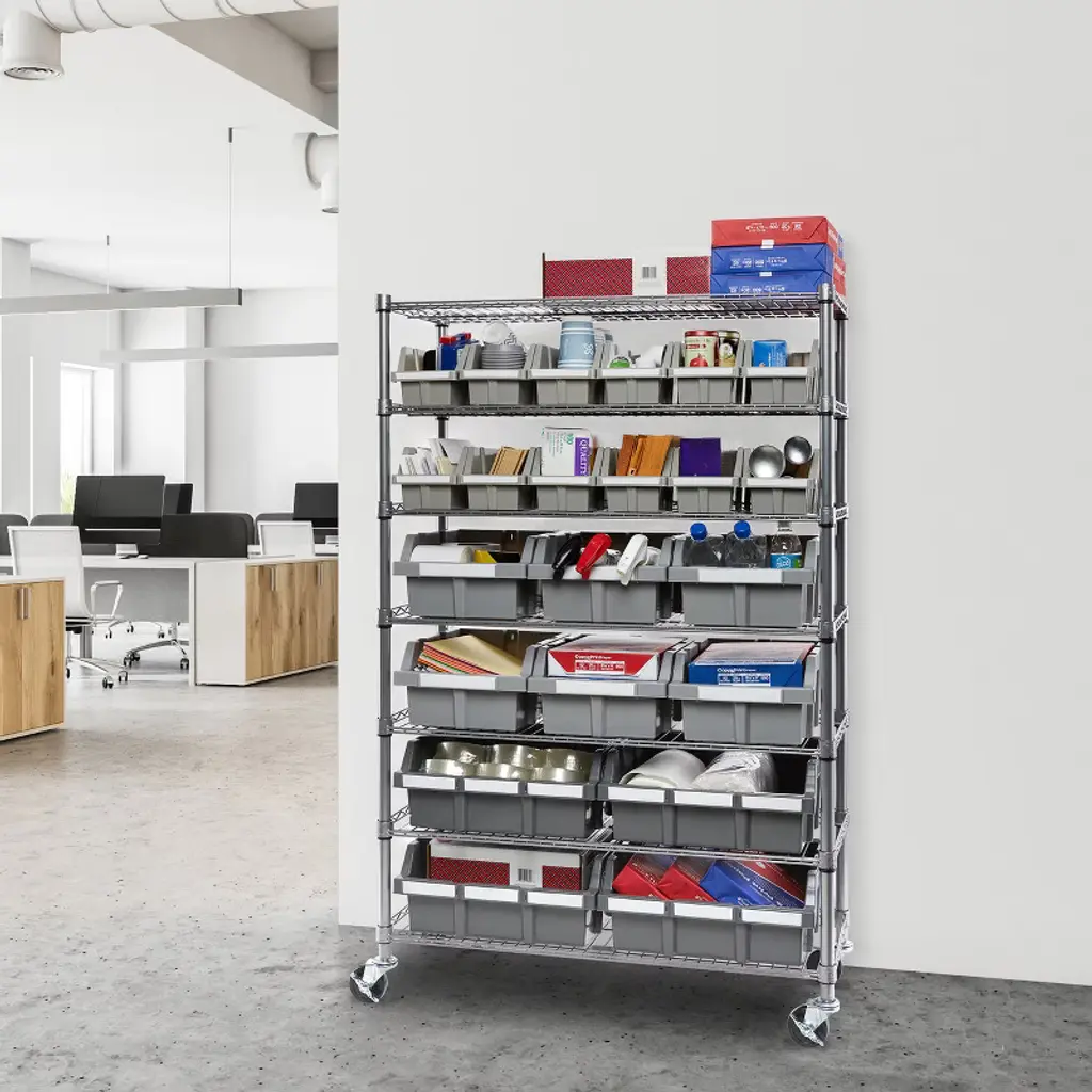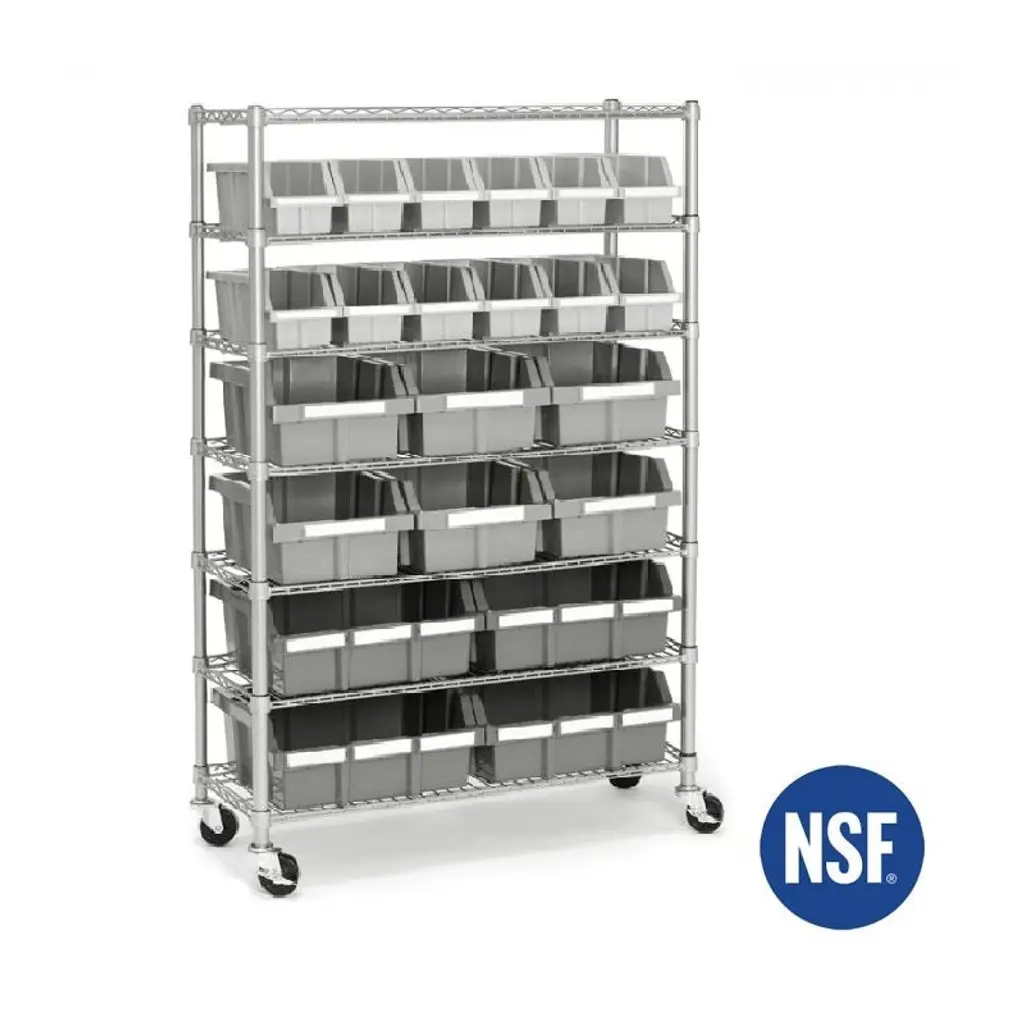 Organize any space with Seville Classics Commercial 7-Tier NSF 21-Bin Rack. This heavy-duty bin rack is constructed from industrial-strength steel and measures 36" wide by 14" deep by and 56" high fully assembled on wheels (53" high on leveling feet). The 7 shelves and 4 poles are coated in a durable epoxy finish for protection against corrosion in dry environments. This patented design features 22 high-impact polypropylene (HIPP) bins (4 X-Large, 6 Large, and 12 medium), and 30 labels. Both four 3" heavy-duty rubber wheels (2 locking) and four adjustable leveling feet included. NSF Certified - NSF/ANSI Standard 2 - Food Equipment for commercial and restaurant use. Use this bin rack system anywhere from garages, warehouses, kitchens, restaurants, mail rooms, schools, offices, to retail environments. No tools required for assembly. Patented design: US Pat. #7,325,697