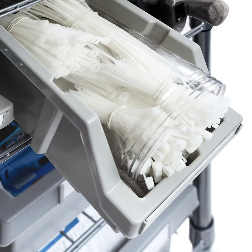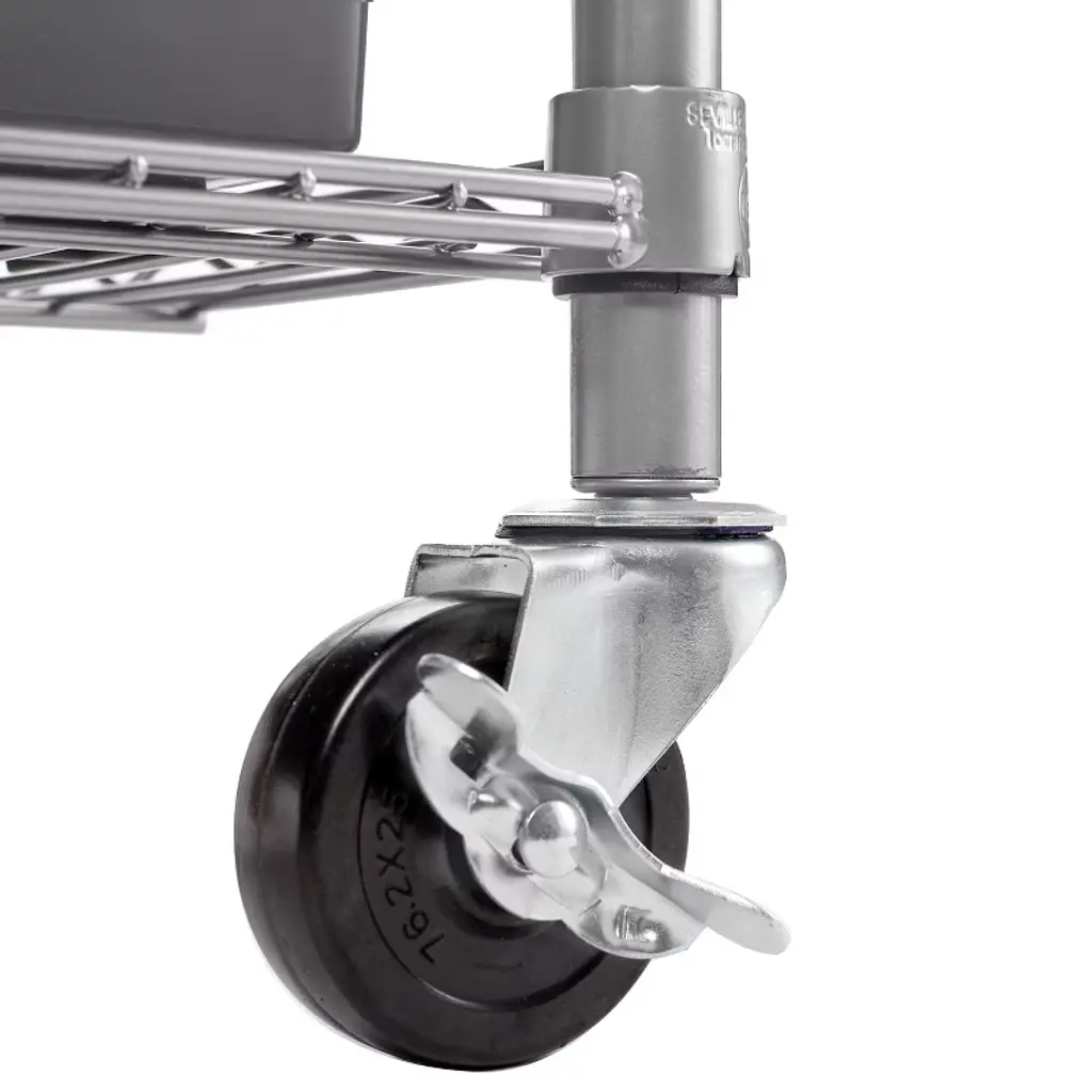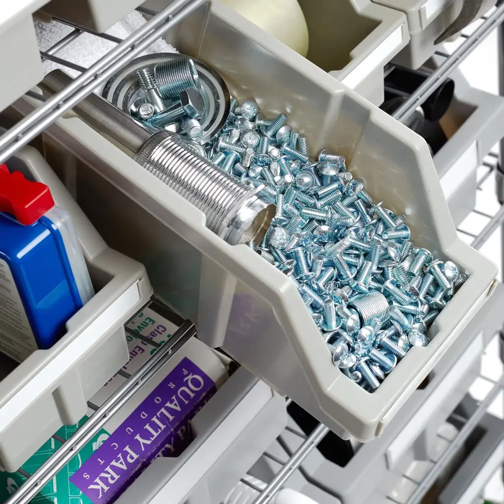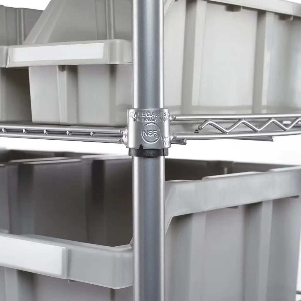 Organize any space with Seville Classics Commercial 7-Tier NSF 21-Bin Rack. This heavy-duty bin rack is constructed from industrial-strength steel and measures 36" wide by 14" deep by and 56" high fully assembled on wheels (53" high on leveling feet). The 7 shelves and 4 poles are coated in a durable epoxy finish for protection against corrosion in dry environments. This patented design features 22 high-impact polypropylene (HIPP) bins (4 X-Large, 6 Large, and 12 medium), and 30 labels. Both four 3" heavy-duty rubber wheels (2 locking) and four adjustable leveling feet included. NSF Certified - NSF/ANSI Standard 2 - Food Equipment for commercial and restaurant use. Use this bin rack system anywhere from garages, warehouses, kitchens, restaurants, mail rooms, schools, offices, to retail environments. No tools required for assembly. Patented design: US Pat. #7,325,697