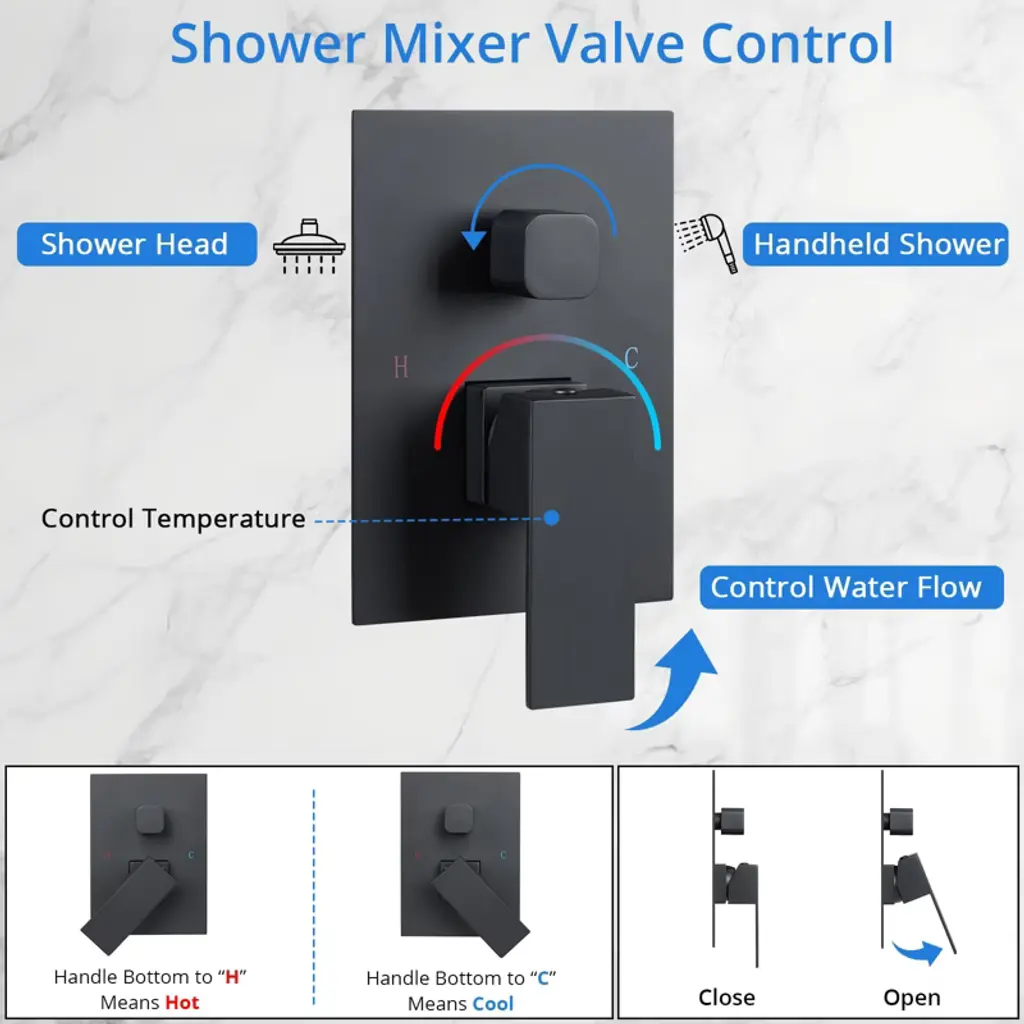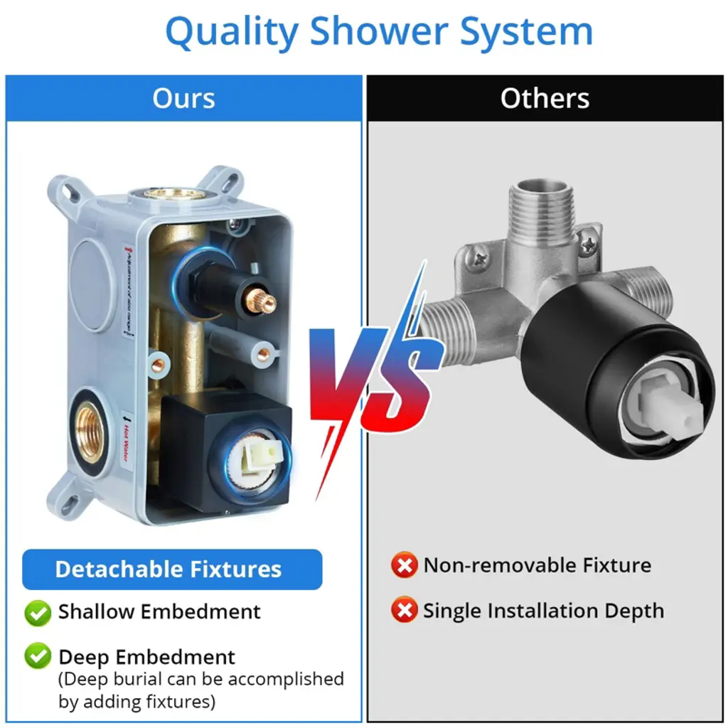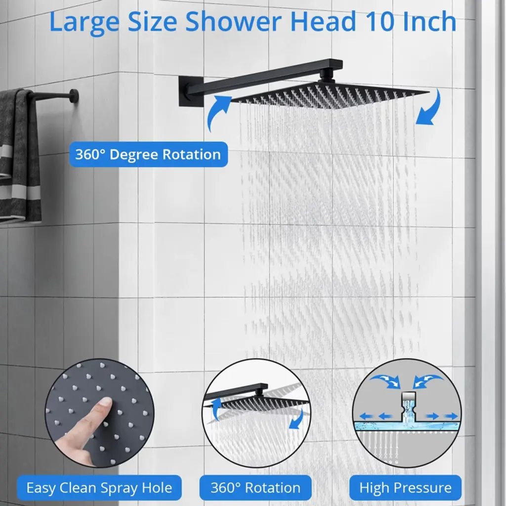 Enjoying a luxurious shower experience with our 10-inch rainfall shower system, designed to deliver a soothing rainfall effect by covering a larger surface area.Made with high-quality materials, our elegant matte black shower system combines durability with style, making it a reliable and eye-catching addition to your bathroom.
